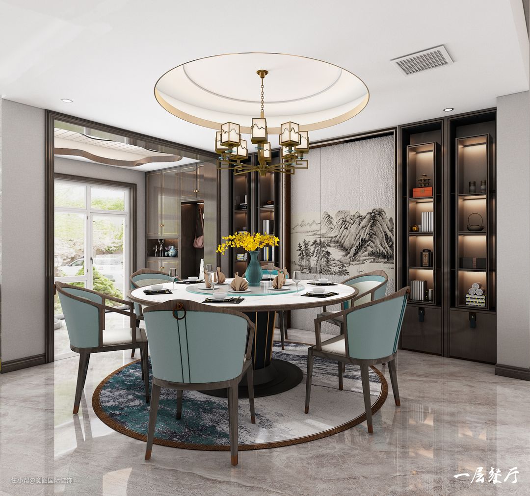 餐厅背景也极具特色,硬包上的山水画与胡桃色展示柜相呼应绿色椅子与灰色地砖相协调整体烘托的中式感觉扑面而来。