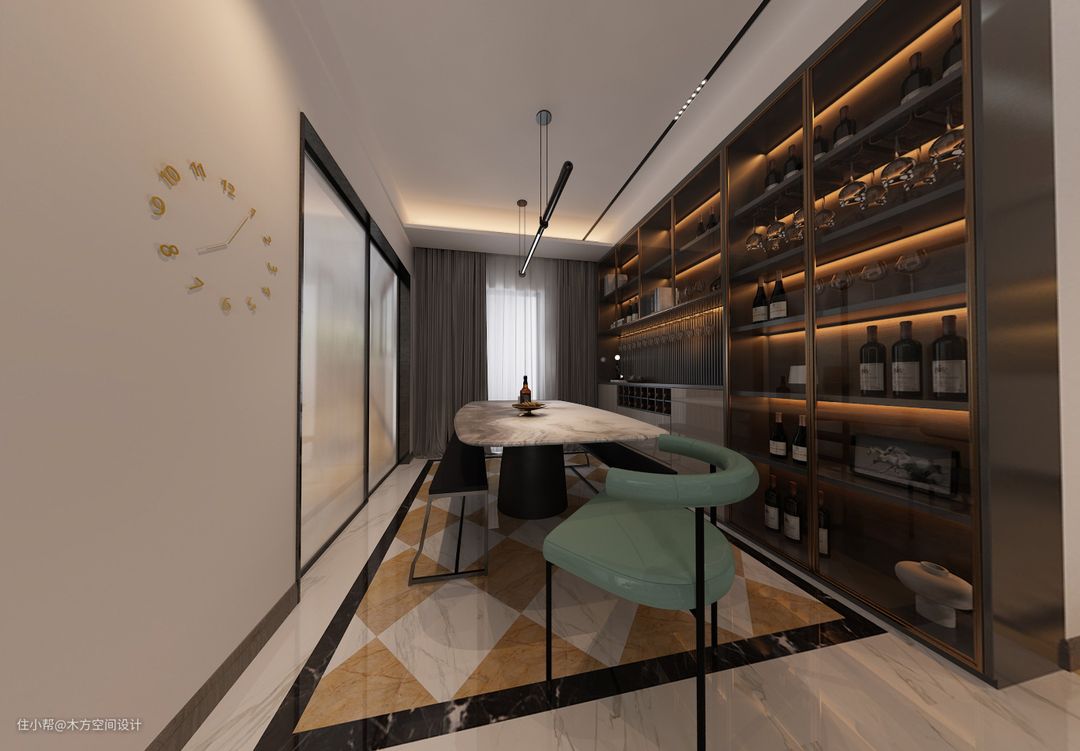 餐厅的酒柜也不是不可缺少的,酒柜采用灰色玻璃+暖光灯带点缀 高显氛围