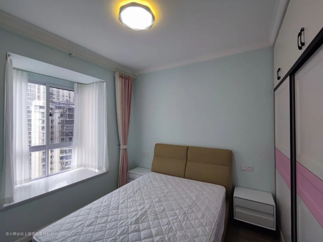 ▲女儿房的配色非常干净温柔,窗户做藕粉拼色窗帘,再加一层窗纱制造柔和的氛围。窗子对面的墙打了满墙到顶衣柜,平时的衣物都可以收纳在内。
