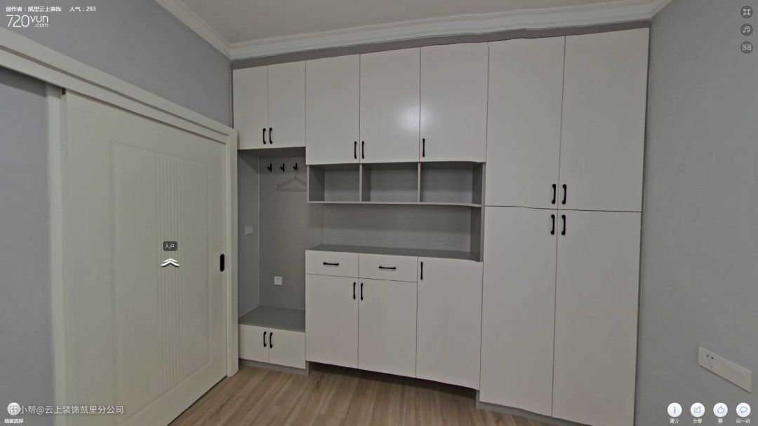 设计亮点 1-户型进门就是客厅,不利风水也不方便 解决方案:在入户门与客厅之间做空间分割,利用玄关柜+屏风做隔断。 2-房屋空间数量不合适,房间太多,有一个剩余 解决方案:利用进门左边的房间做成多功能间,既解决了放鞋问题,平时健身也可在多功能间内活动。