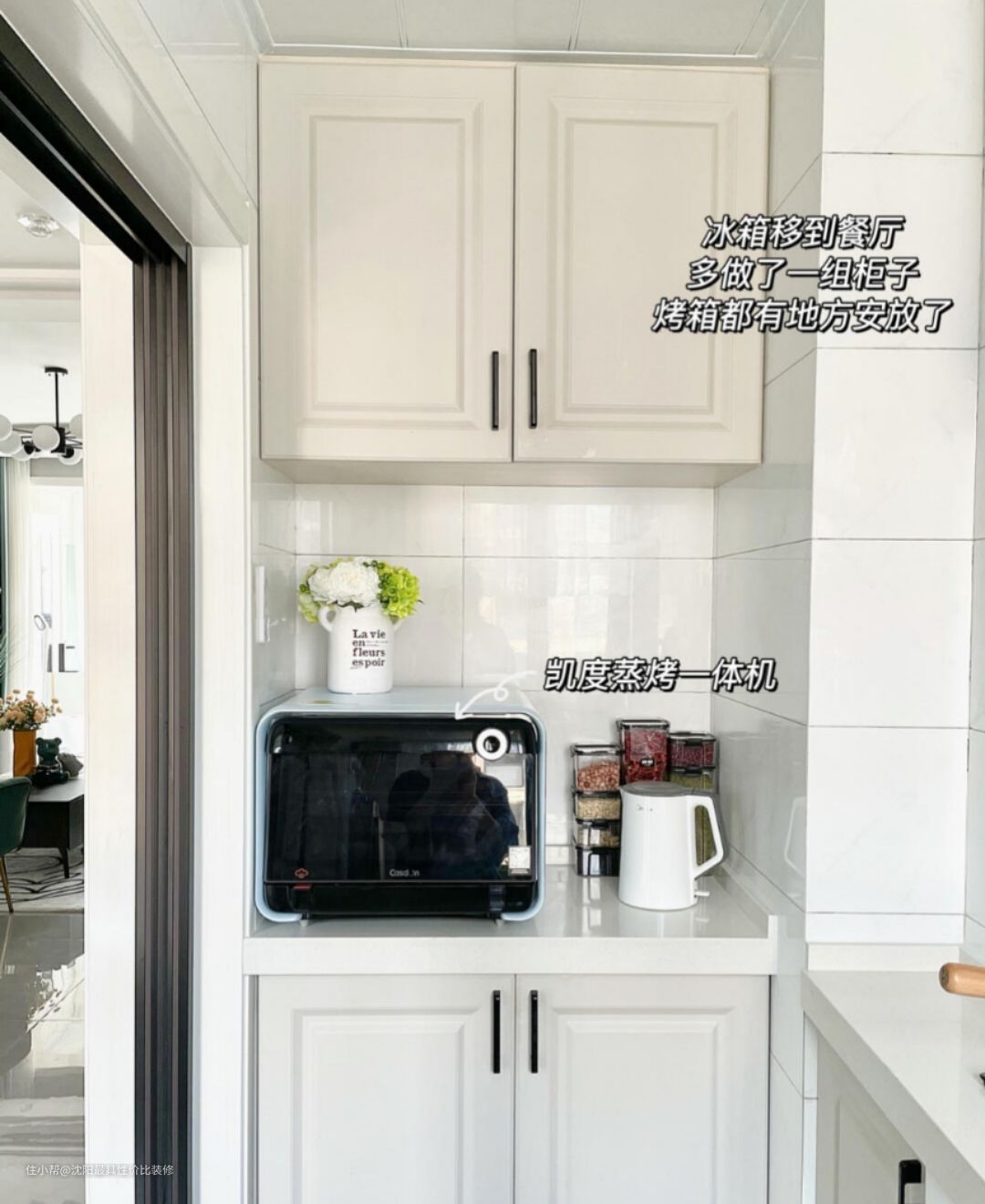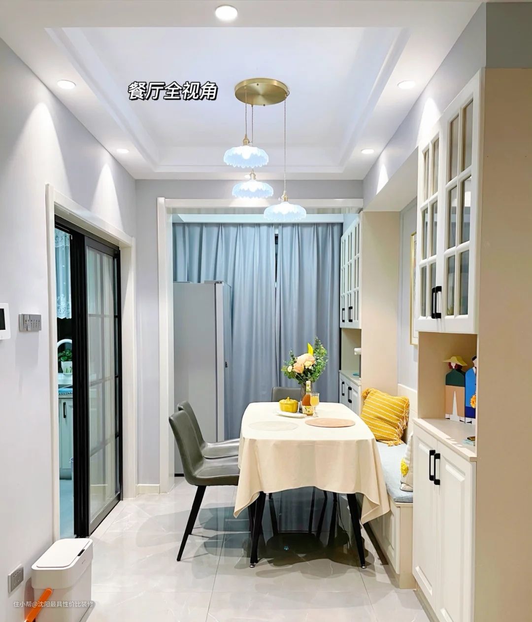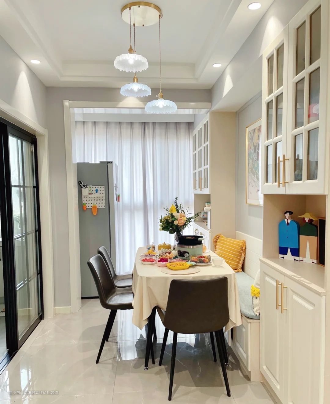 因为窄长型很难放餐桌,所以结合酒柜做了一个卡座,这样做的优点是节省空间面积,保护墙面,储物功能强大,舒适度度更好。