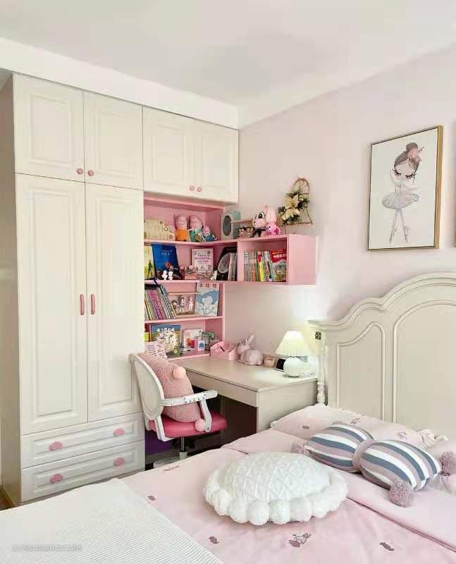 空间小就要增加功能方面的设计,实现多元化。学习+玩耍+休息一体的小房间,书柜书桌衣柜一体化设计,有效节省了空间。