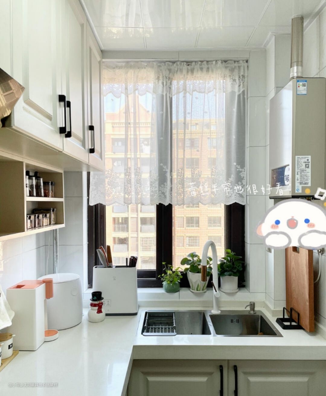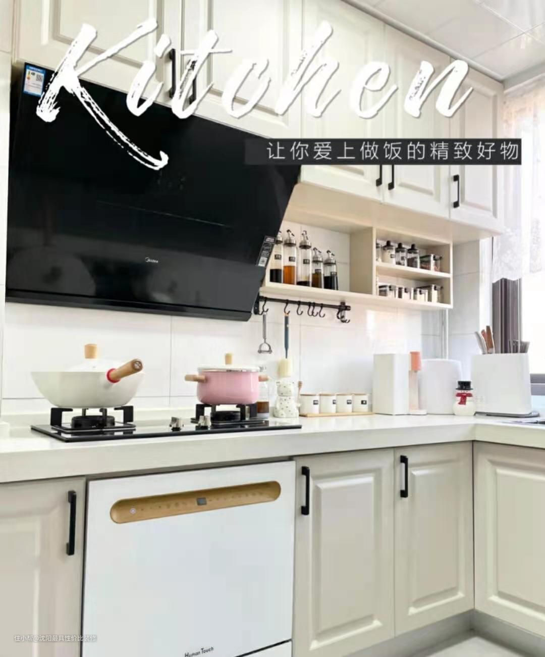 整体家具和制作柜子以暖白和米色为主,清新自然,搭配木质地板有种回归自然的感觉。