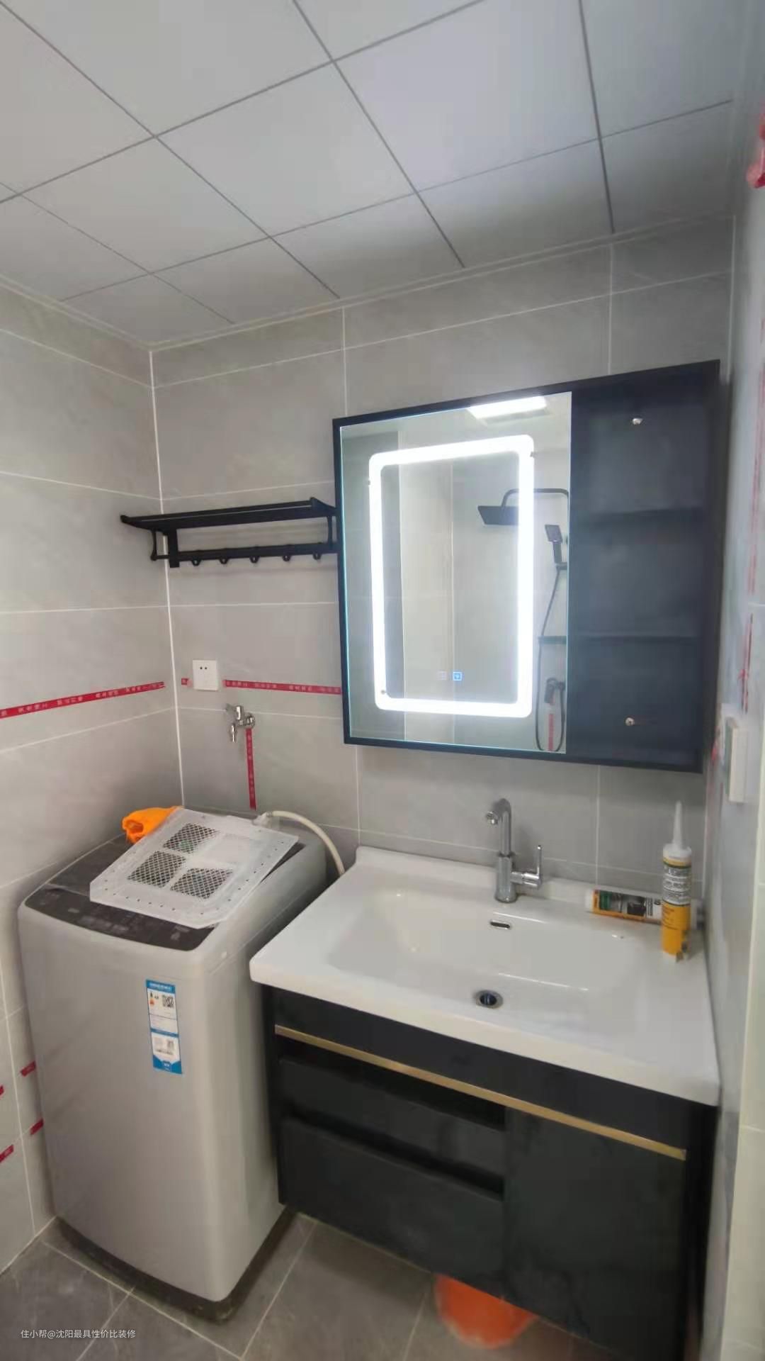 整体灰色调,镜柜具备储备空间,镜前灯可以调节亮度,带有除雾功能,黑色花洒颜值特别高,搭配同色毛巾架