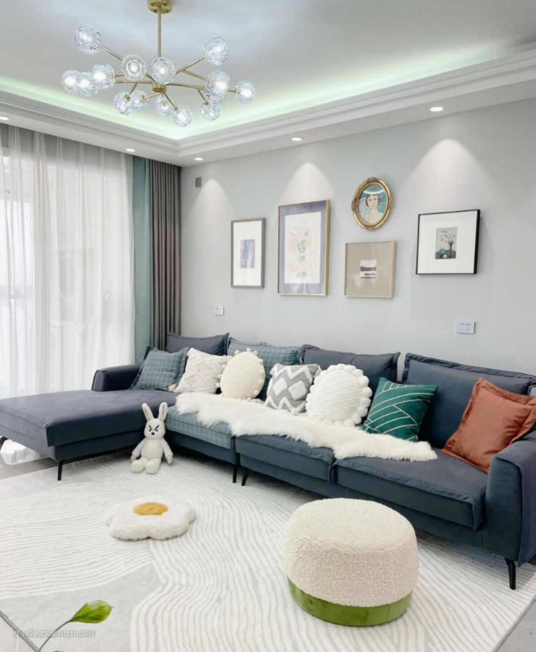 家居整体配色以灰色为主,地面看着有些暗沉,就搭配的浅色地毯,带几何流水纹路,提升整体亮度。