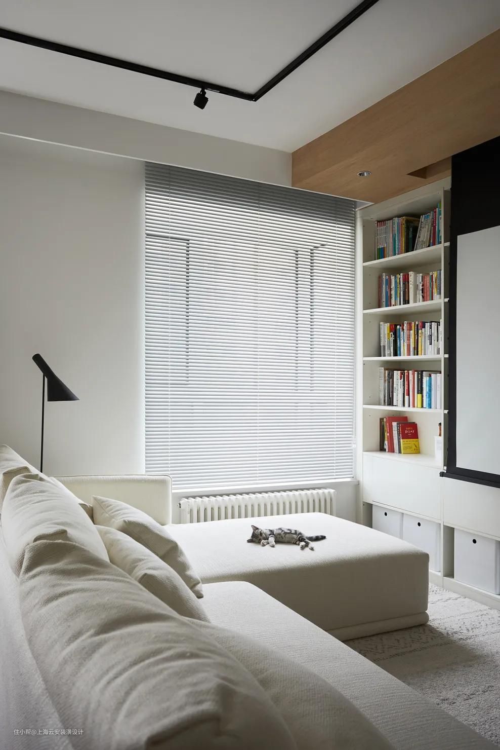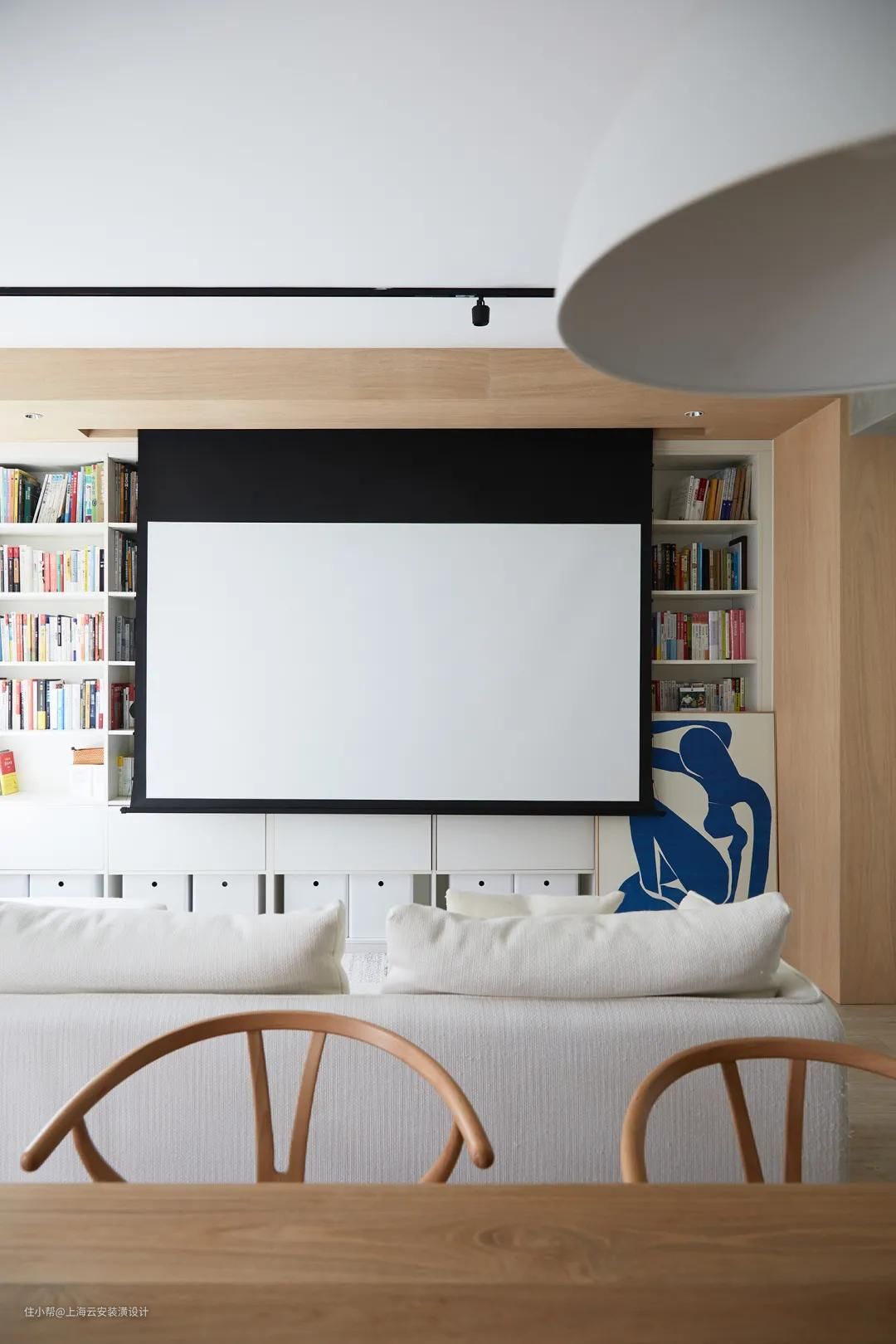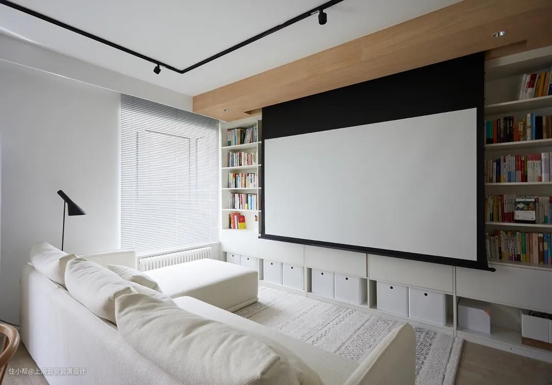 天花板上的木质结构有三处作用: 1、无缝衔接旁边柱体,拉齐凹凸不平的立面,有效整平空间视觉,塑造出方正领域; 2、与白色书柜颜色形成深浅对比,丰富视觉变化; 3、里面的凹槽装有投影幕布,想看电影的时候拉上百叶帘,拿出极光投影设备,秒变舒适的家庭影院。