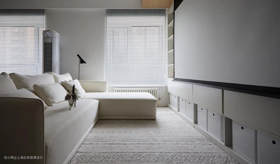 客厅整体氛围的设定以简单干净为主, 没有采用沙发、电视、茶几的传统布局。