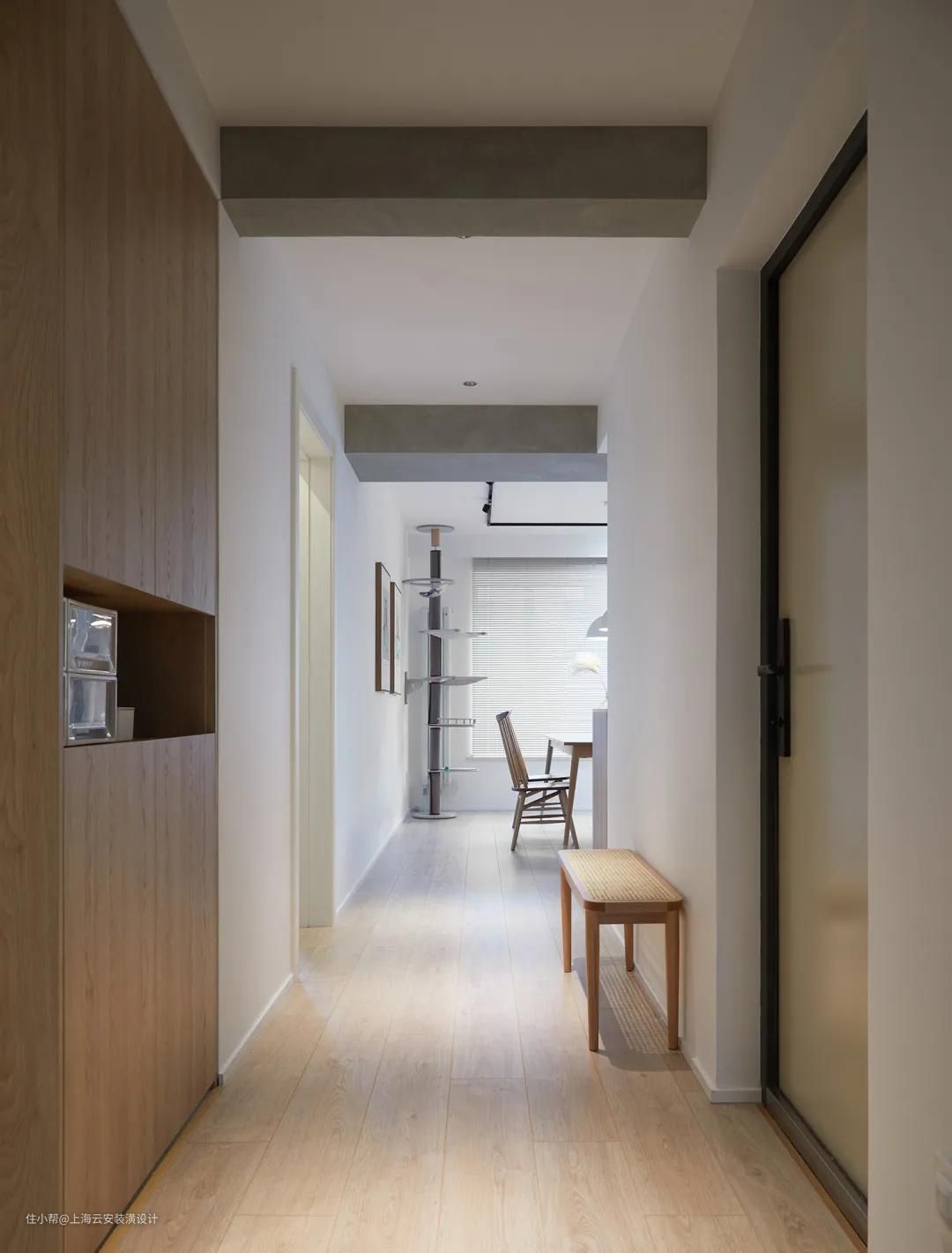 将两个暴露在外面的梁体 用水泥质感艺术漆美化造型, 消除视觉上带来的压迫感, 另外一个横梁和厨房天花板拉齐, 几乎感受不到它的存在。 顺应墙体结构设计了顶天立体柜, 由鞋柜和家政柜两个部分组成, 鞋柜尺寸和位置顺应玄关大门, 中段做挑空,能放置小物件。