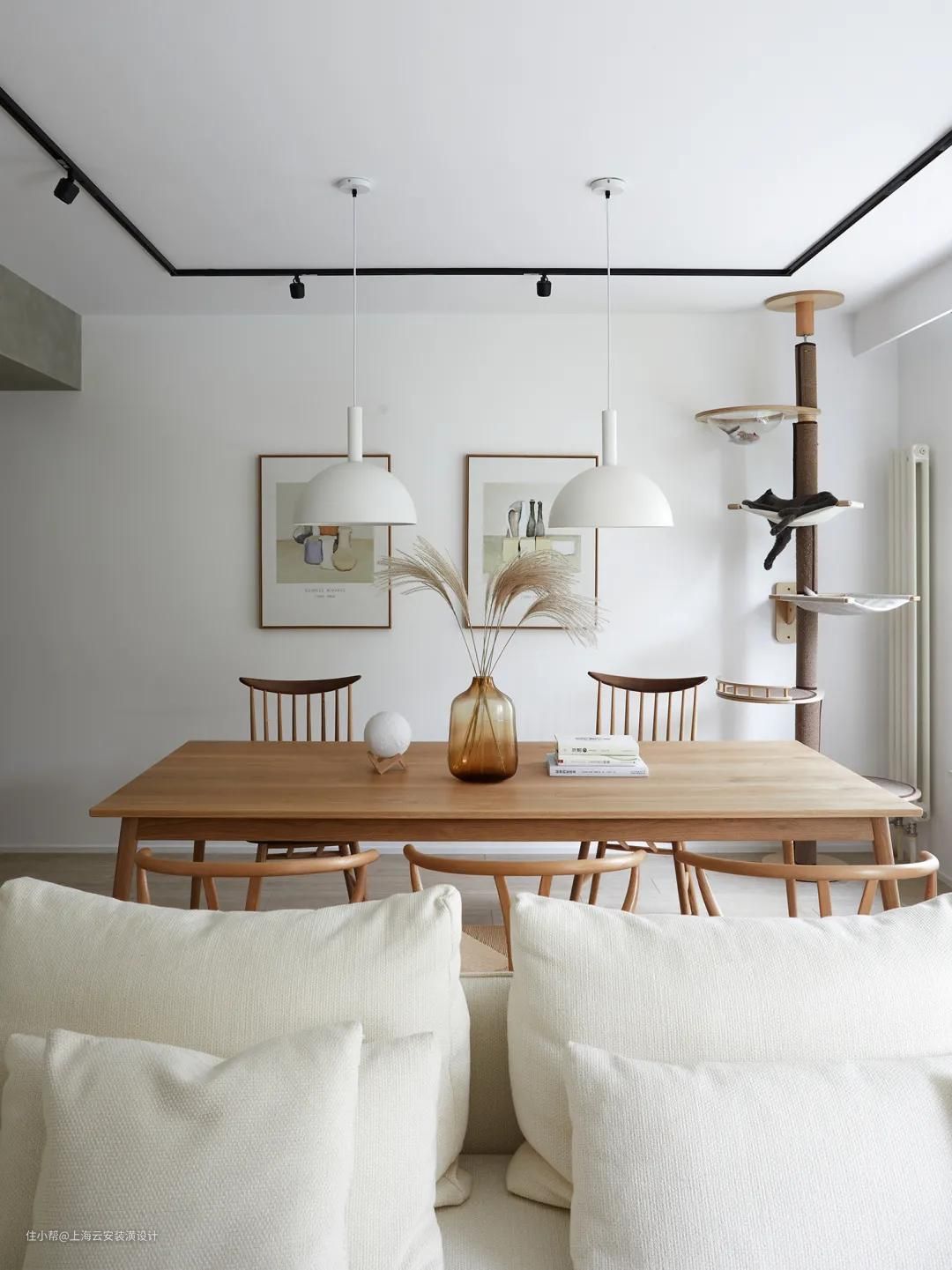 自然温暖的木质基调, 配上白色和淡淡的浅灰, 呈现出最舒服怡人的自在感。 窗台旁边通顶的猫爬架, 为两只猫咪提供了趣味性的休息空间, 也为房间增加了温馨之感。