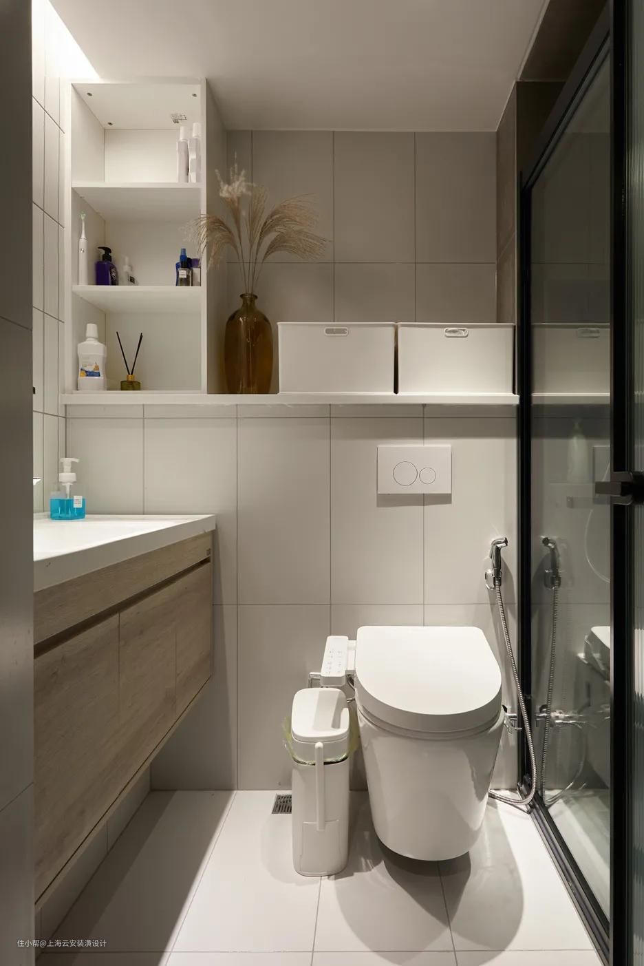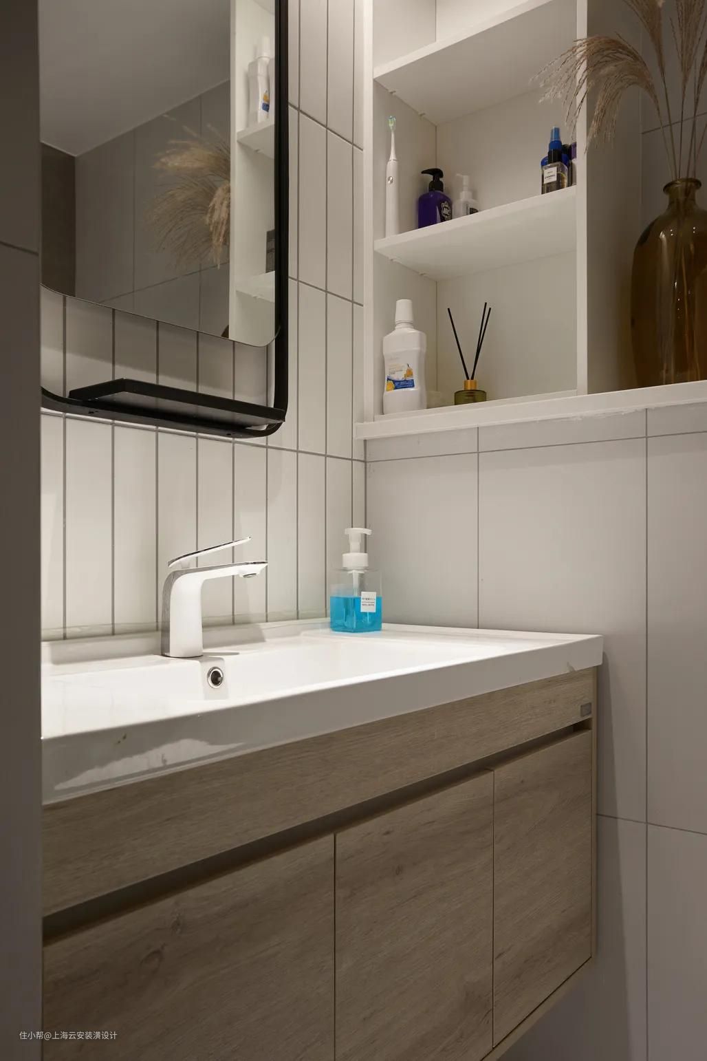 卫生间做了干湿分离, 置入尺寸合适的台面和收纳柜, 摆放卫浴用品一目了然。 除了提供浴室用品收纳外, 也是女主人的梳妆区,动线流畅。