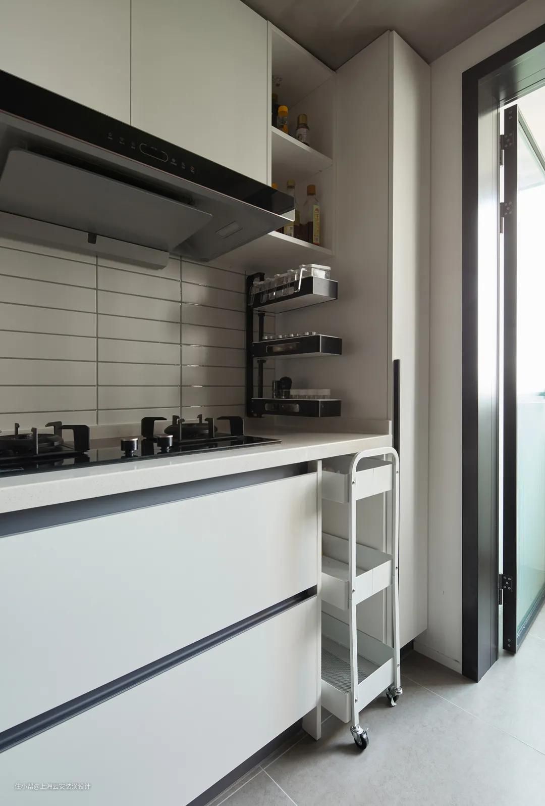 靠近阳台的白色柜体里包有管道, 同时可以储物,旁边做了开放格, 挨着油烟机,可以放置常用调味料。