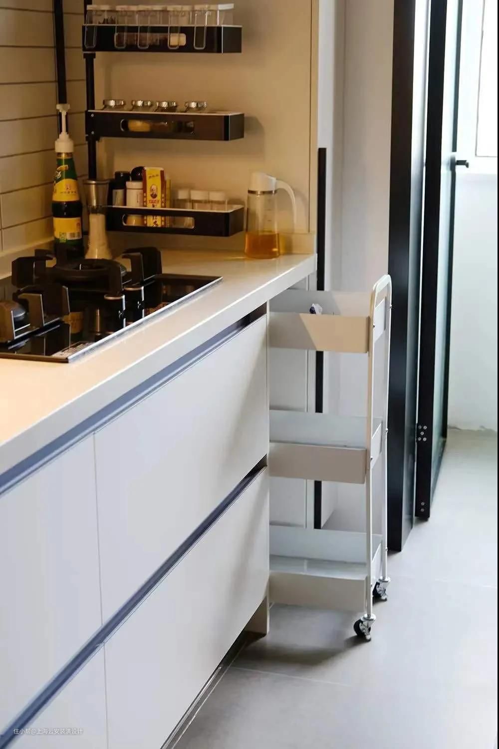 地柜没有做满,留出地方放小推车, 不用放冰箱的食材就可以放在推车里, 方便用的时候随手拿取。 吊柜下方安装感应条形灯, 可随手赋予照明,也可以营造气氛。
