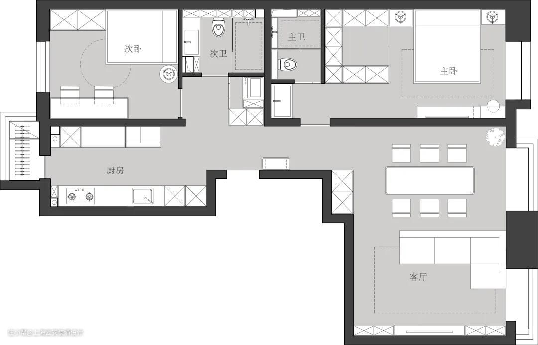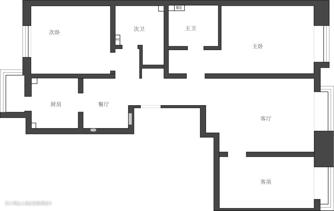 房子为典型的旧三室格局:三小一大, 客厅小,厨房小,餐厅小,卧室大。 卧室的面积足足有37m², 可是客厅只有16m², 不适合现代年轻人的生活方式; 室内动线封闭,天花板结构梁低矮, 房间棱角多,给人压迫感。