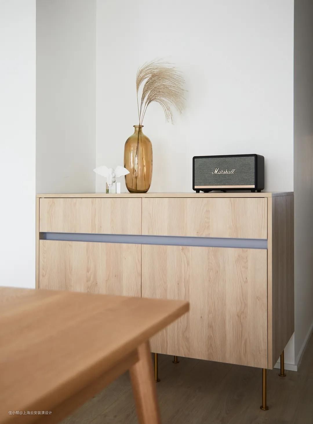 侧面是量身定制的餐边柜, 方便小物件的摆放与展示, 成为一进入客厅的独特视觉焦点, 还能隐藏扫地机器人。