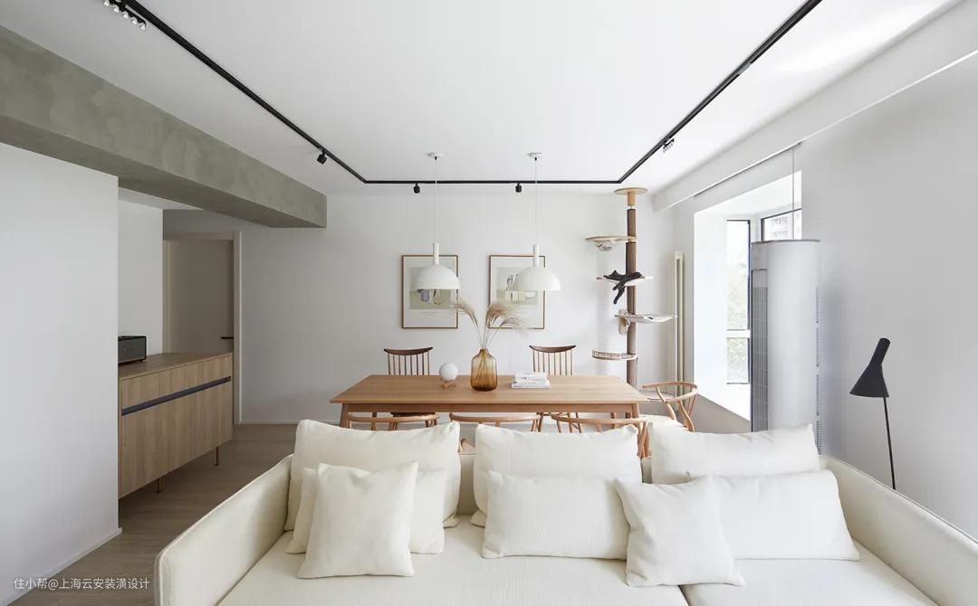 本身的横梁拉低了层高平均值, 所以全屋没有做吊顶、没有装主灯, 没有安中央空调,只装了新风系统。 客厅用明装磁吸灯做照明, 自由调节氛围感满满的光影效果。
