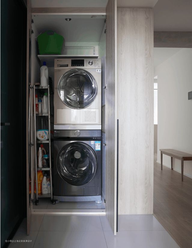 家政柜用于存放各式清洁用品, 柜门内侧设计有穿衣镜, 此外还收纳了洗衣机和烘干机, 解决了机器运作时产生的噪音问题, 外观上看起来干净利落。