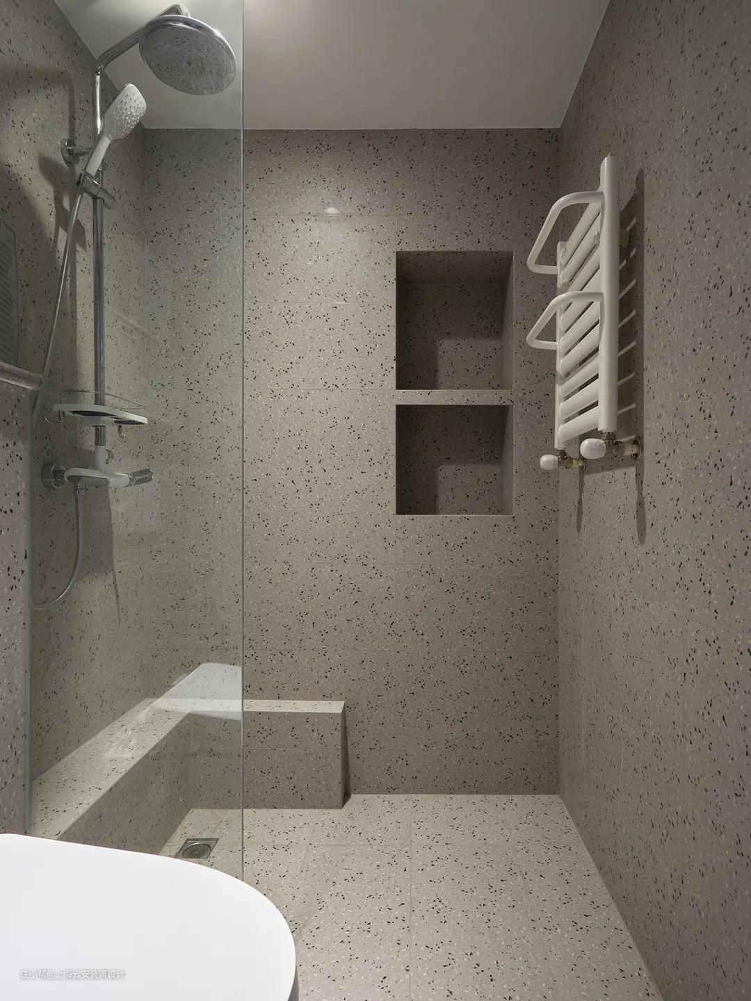 墙壁和地面均是水磨石样式的瓷砖, 墙面因为下水管道原本也是崎岖不平, 壁龛设计既能修整立面还能收纳。 浴室下方凸起的部分同样包有管道, 干脆都铺上瓷砖,能放东西也能坐人。