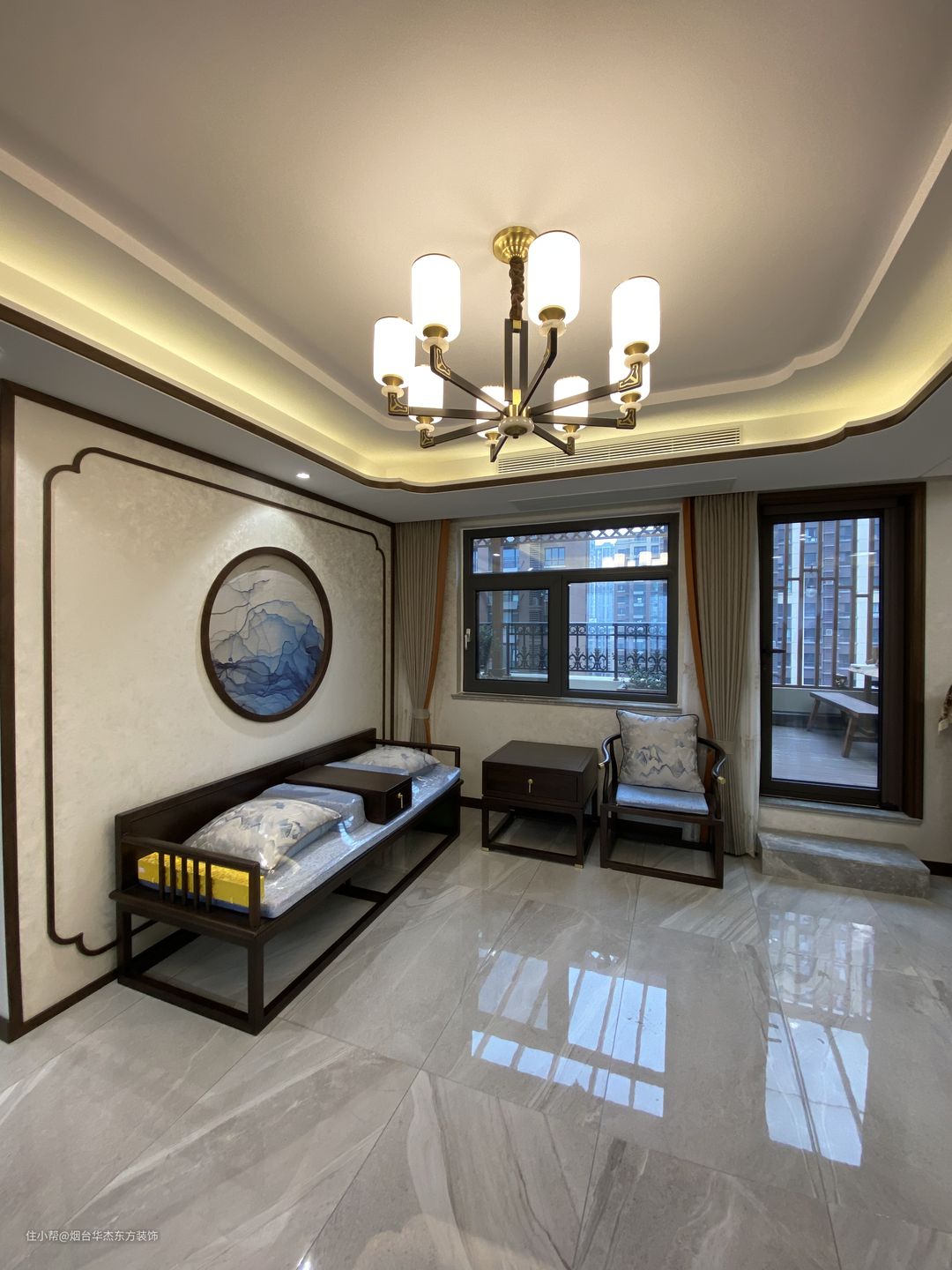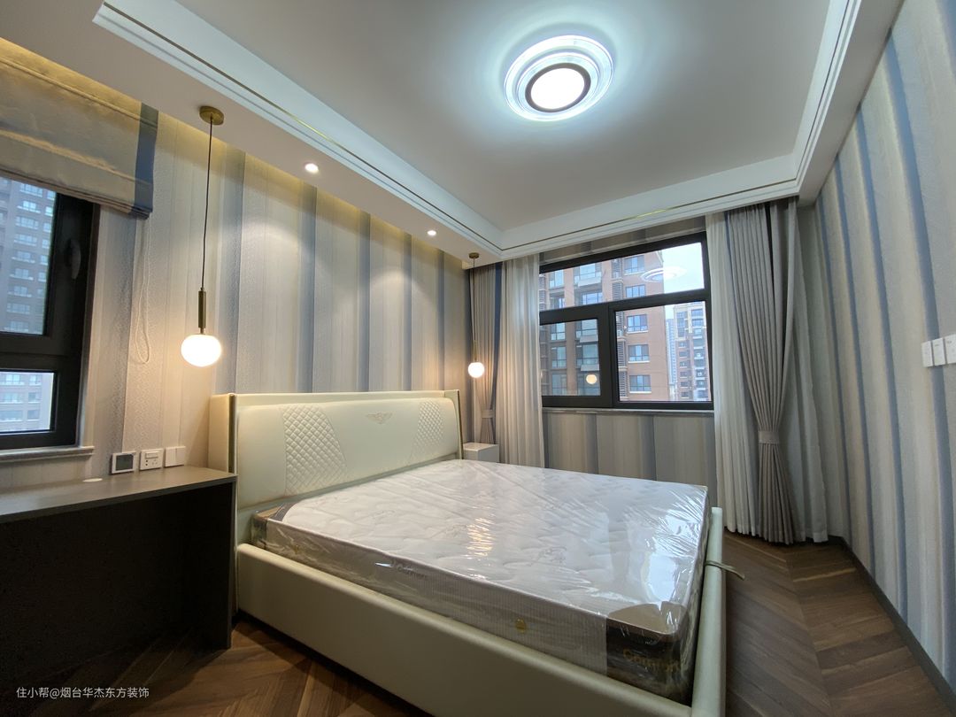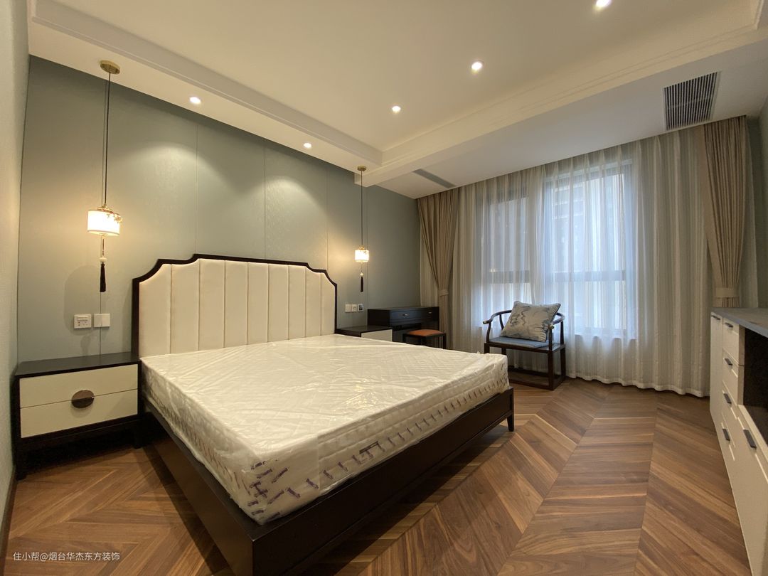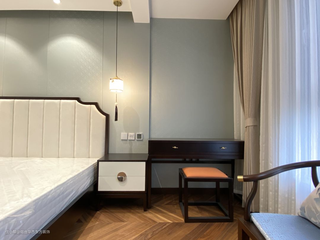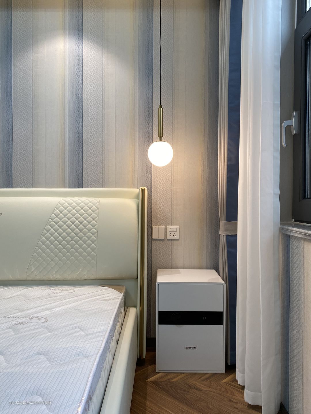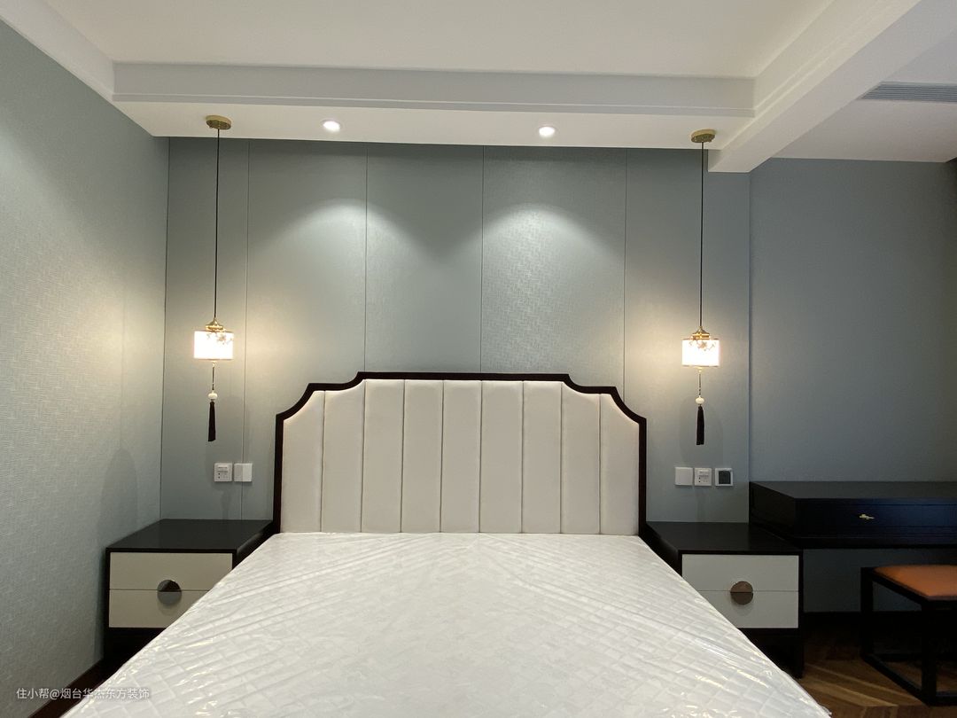 楼上卧室延续纯色硬包背景,搭配优雅的中式线灯,不过分强调风格,又能从细节处感受到东方人文。