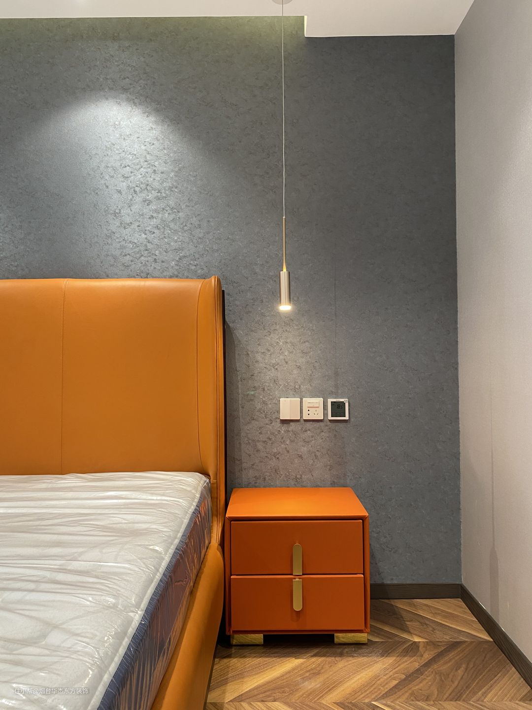 爱马仕橙,这抹高明度色彩作为深色调的调剂色彩再美妙不过。一楼卧室大胆搭配爱马仕橙色床及床头柜,让缺乏活力的卧室空间一下活泼了起来,床头线灯、隐形灯带及点光源的设计让每一个角度都出彩。