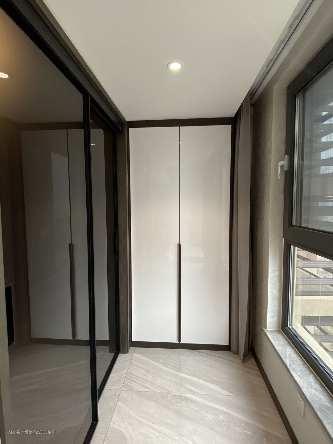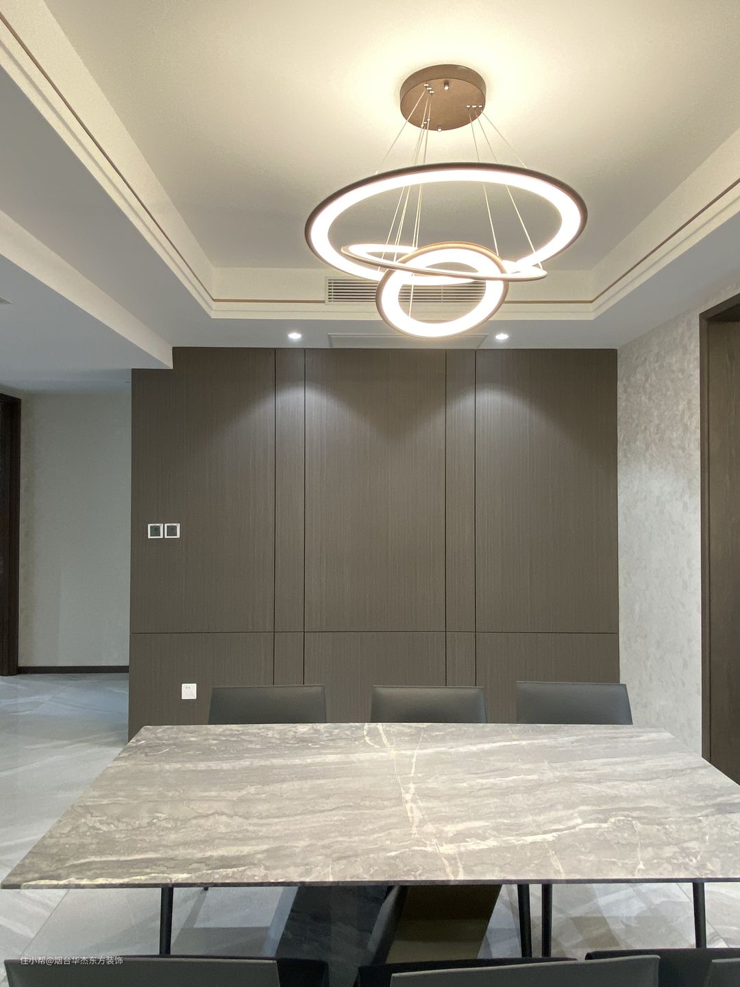 本案为大开间户型,客餐厅的空间相关联,餐厅背景墙作为客厅沙发背景的延续,保持了材质及色调的统一,大限度的拉伸了视觉效果,灰色饰面板与大理石纹地面结合,大面积铺贴的素色壁布更具肌理感,细微色调深浅不一,丰富整个空间的层次感。