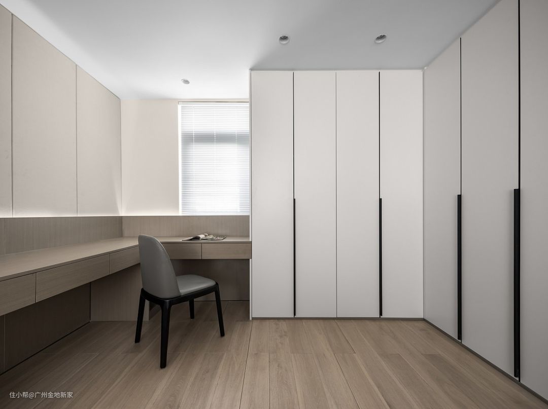 开放式衣帽间与梳妆台、书桌的组合设计,简洁舒适。