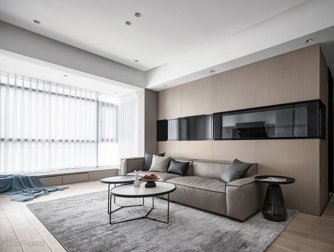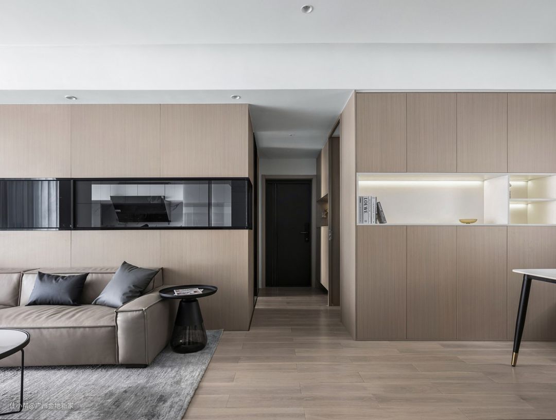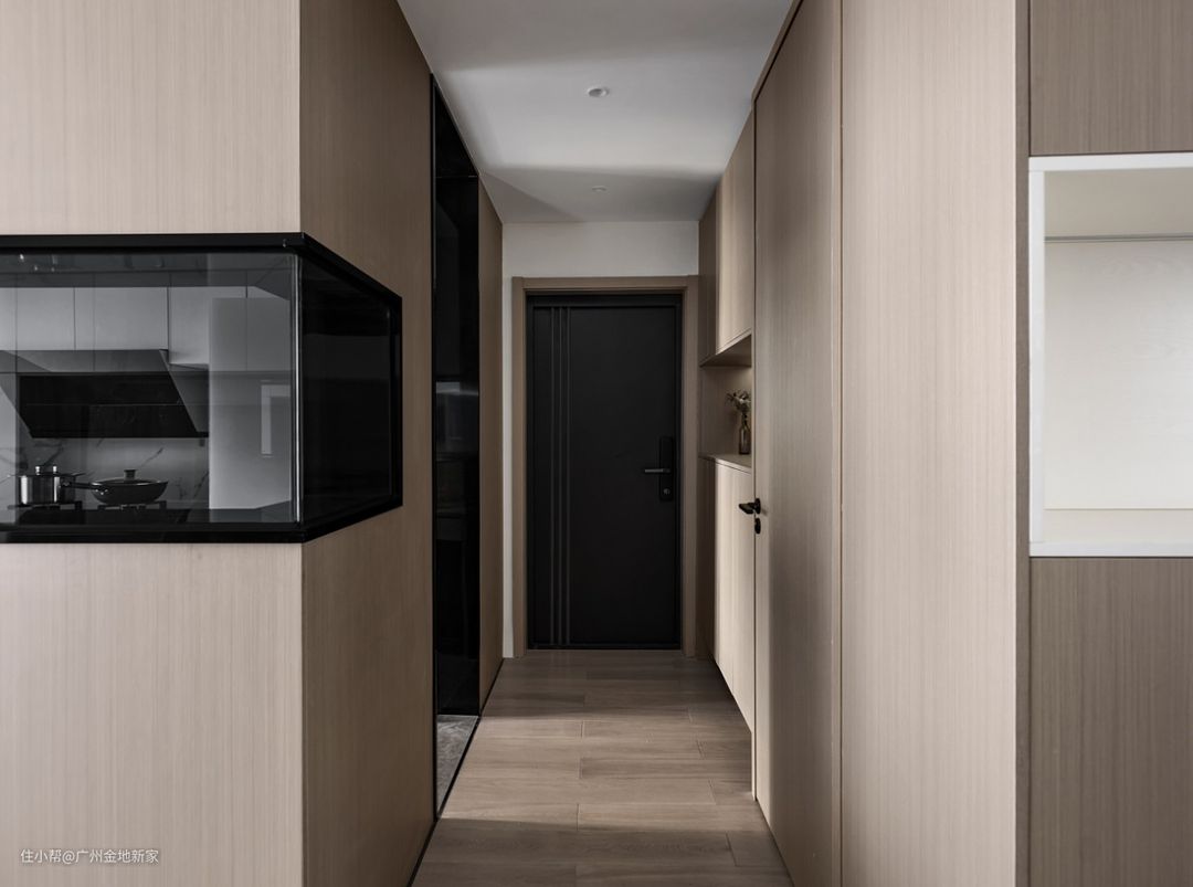 客厅与厨房之间设置半通透黑色玻璃,营造空间之间的交互感;长辈房隐形门与鞋柜、餐边柜统一材质表现,收纳柜一门到顶,使得空间更加简洁流畅。