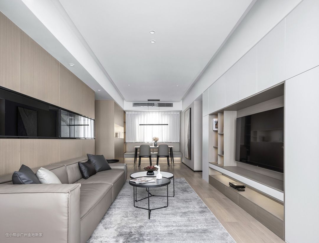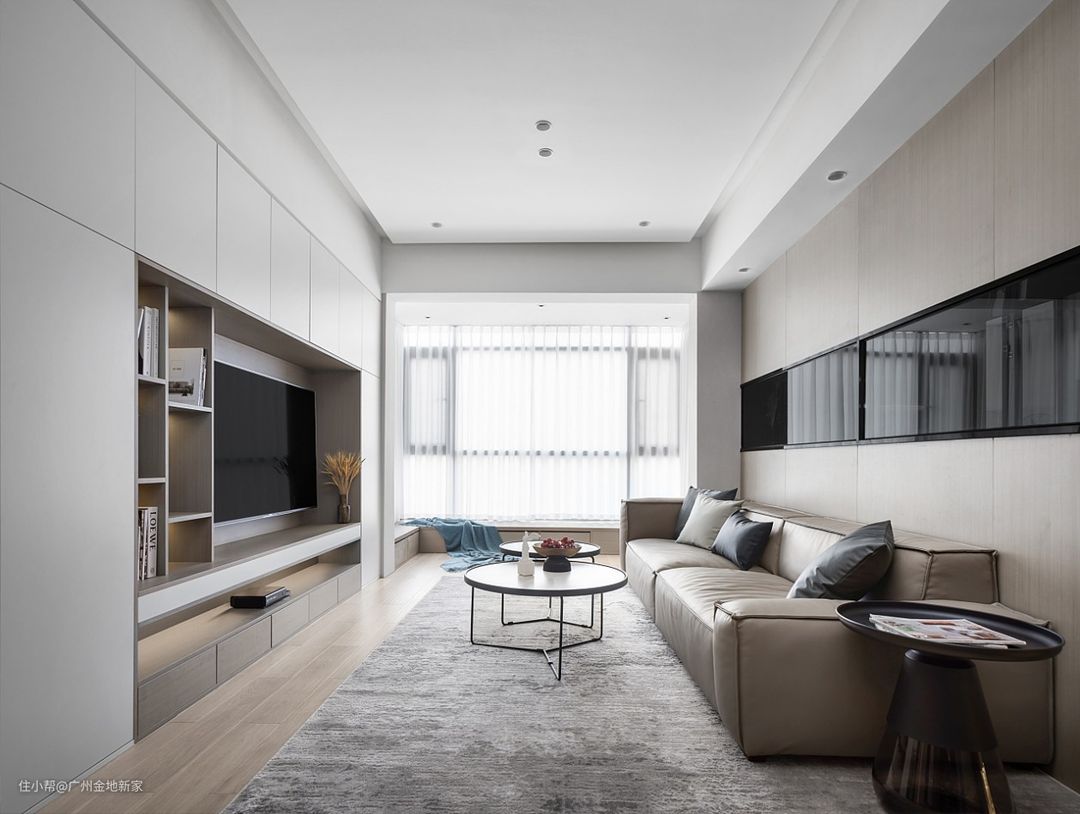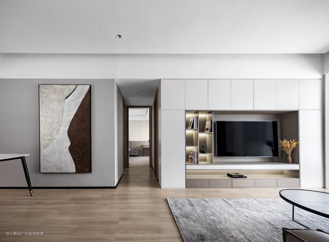 电视背景墙简约的设计,美观与收纳结合,把电视嵌入整体柜体设计,留下充裕的收纳空间。