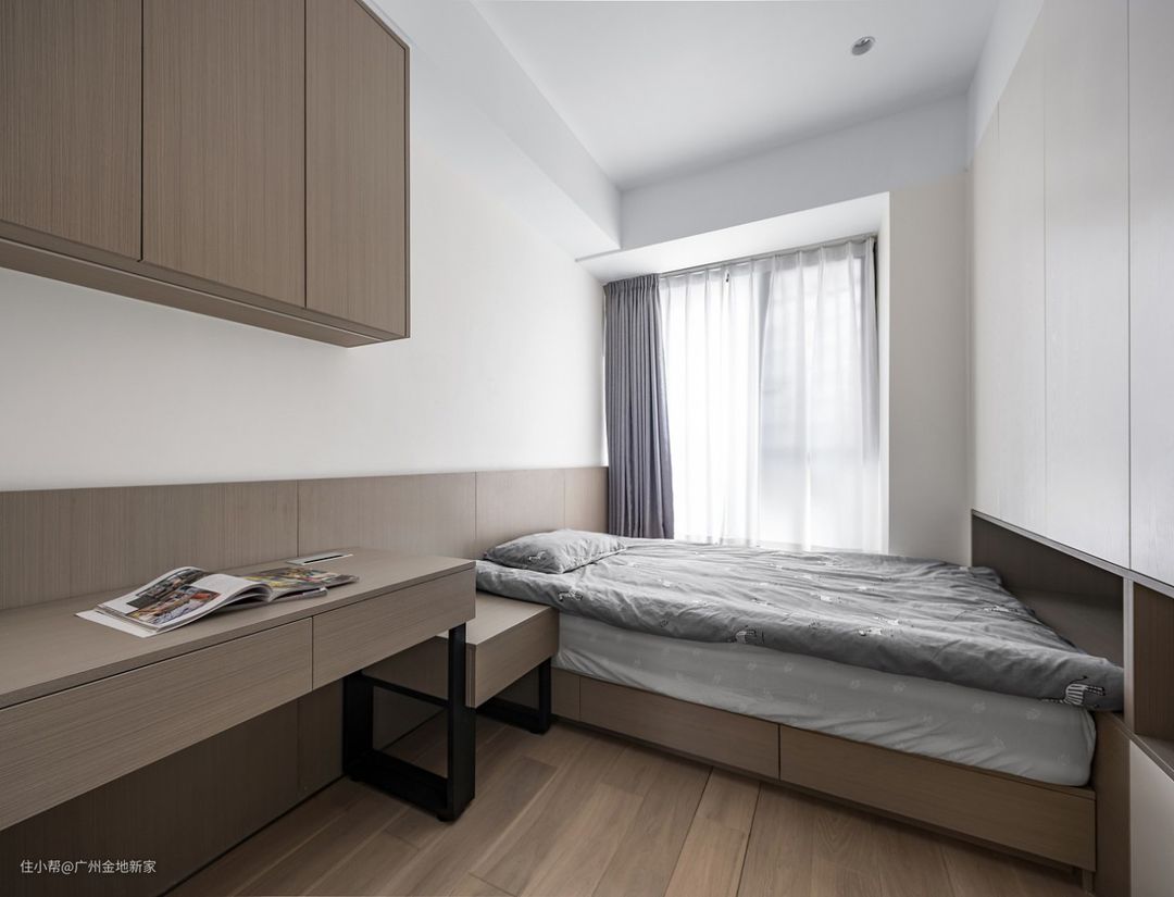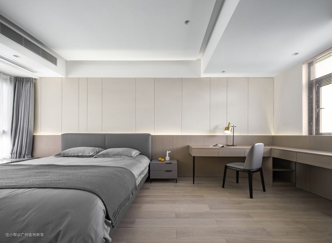 主卧素雅明亮,木材质与暖白色的使用搭配,打造了一个纯粹、自然却又很柔和的睡眠环境。