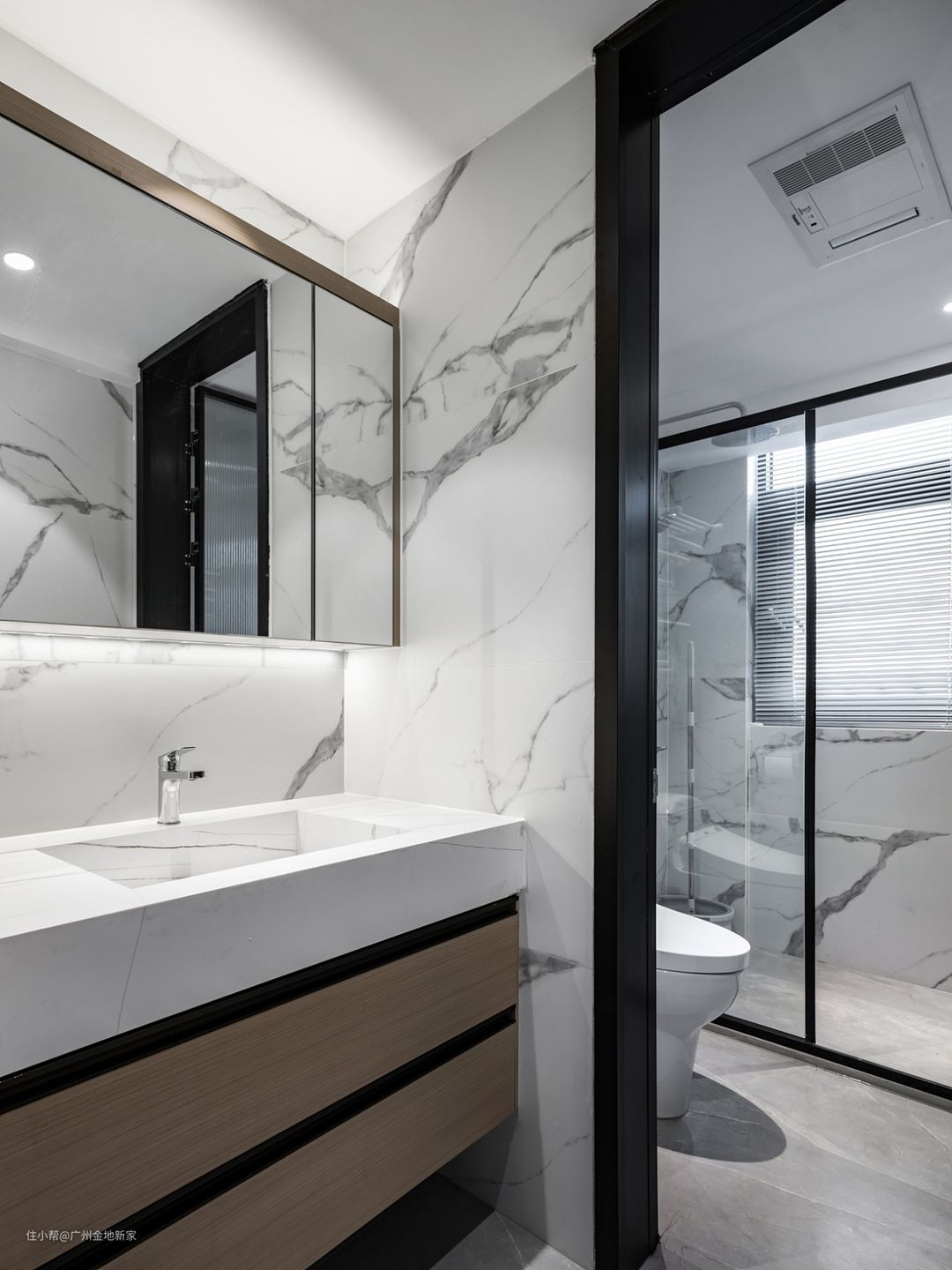 卫生间延续整体空间色调,岩板一体盆设计,搭配好用耐看的洁具,营造舒适简洁的洗漱空间。