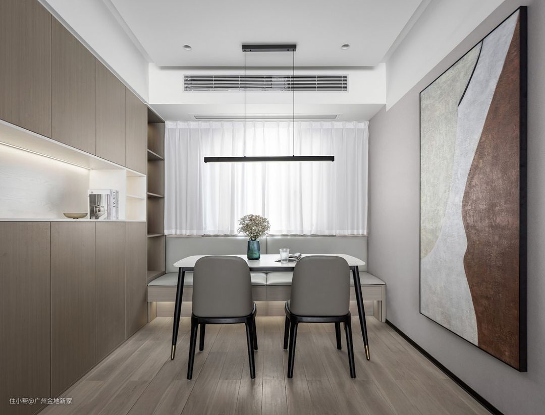 餐厅区域设计了卡座的形式,就餐人员可以更灵活搭配使用。现代简约抽象的手绘油画,多了一份艺术气息。