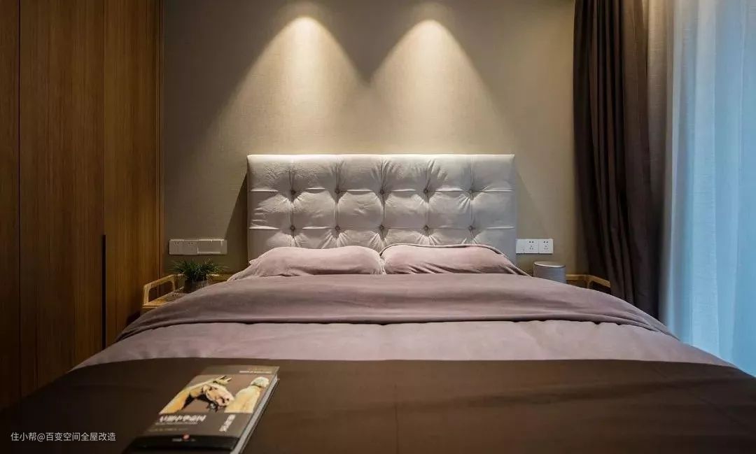主卧室的床头背景墙刷成了灰色系,在吊顶上装筒灯,带来方便阅读的光线,左右两侧对应的床头柜设计,给卧室带来了对称的美感。