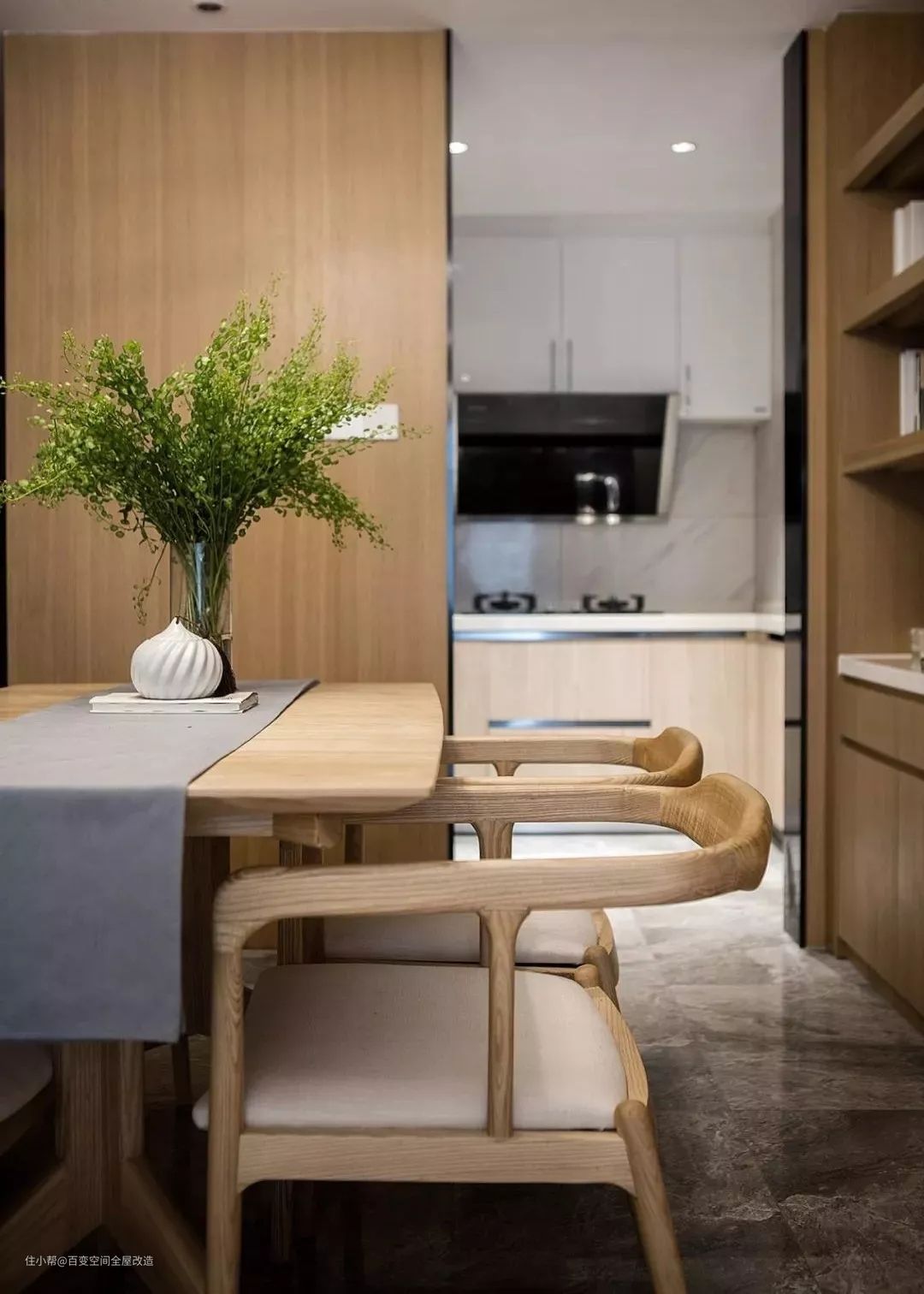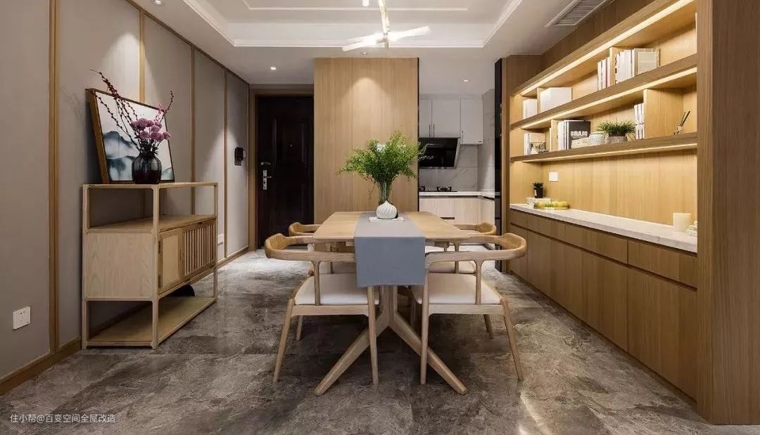 走过玄关就到了餐厅空间,原木风的餐桌椅,在餐厅的侧方还做了到顶的餐边柜,封闭式柜子和开放式搁架组合起来,再加上藏光之后非常好看。