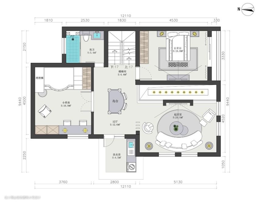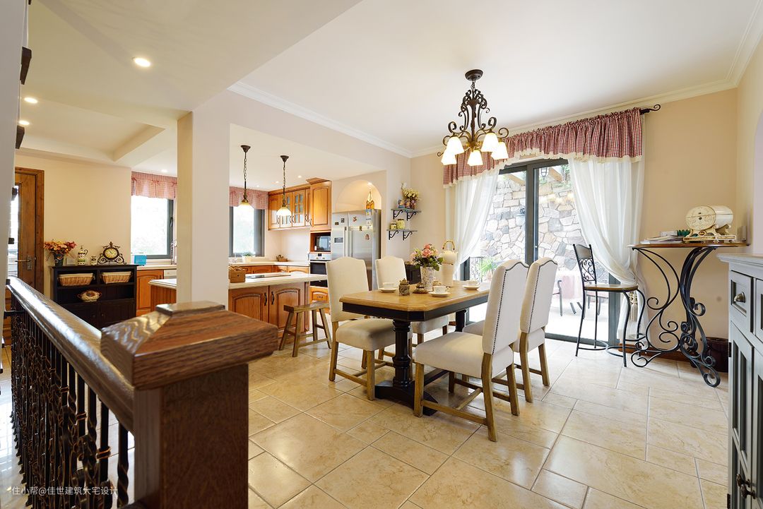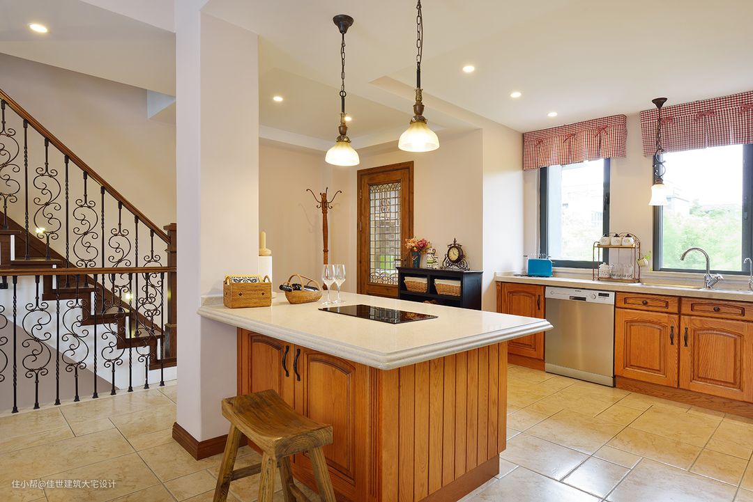 中岛台是很多别墅户型中,最常见的设计点,结合室内材质的风格,从厨房很好的转接到了餐厅。