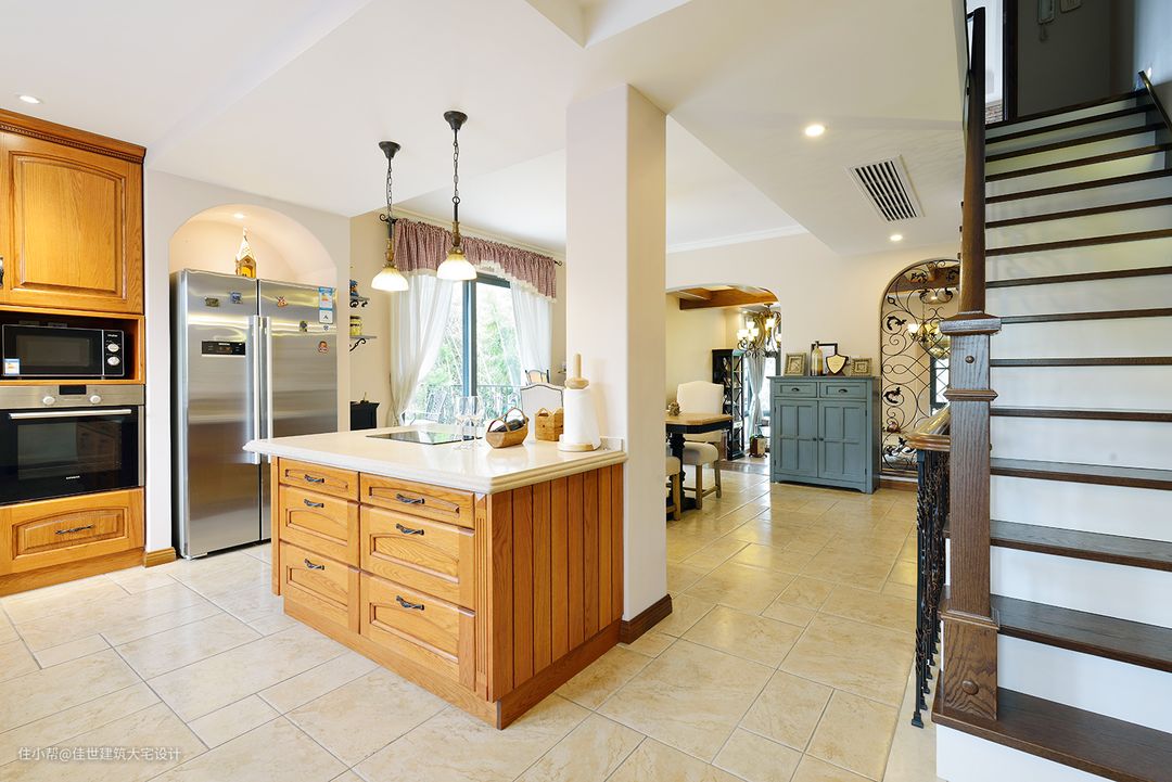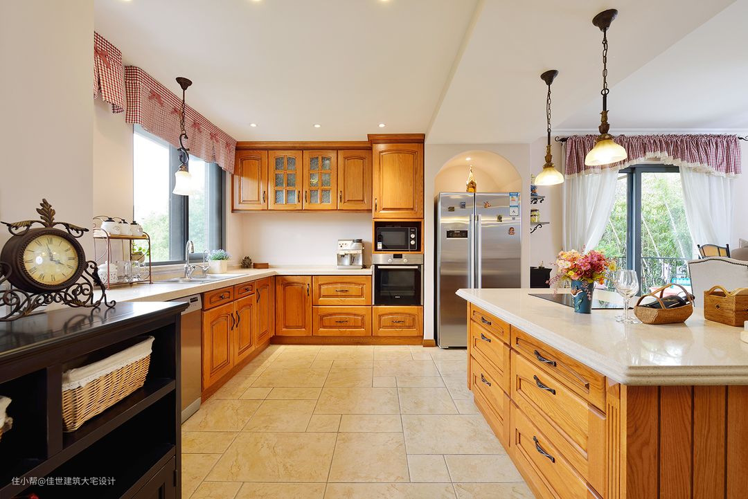 超大施展空间的厨房,L型的操作台,蒸烤箱、洗碗机的最佳安放之处;就连双开门超大冰箱的背景,也特意设计成了拱形,上方留出的扇形空挡,也成了一处不一样的风景线。