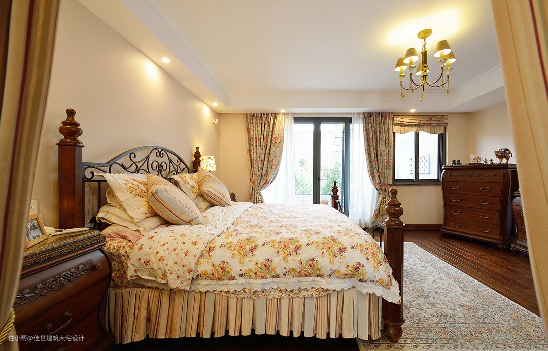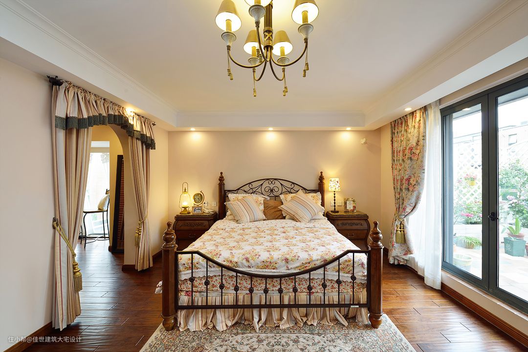 主卧主题就是“小碎花”,延伸了客餐厅的铁艺和自然的元素,窗帘、地毯和床品让“小碎花”得到了升华。