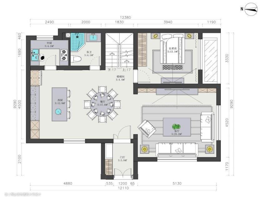 中岛台是很多别墅户型中,最常见的设计点,结合室内材质的风格,从厨房很好的转接到了餐厅。