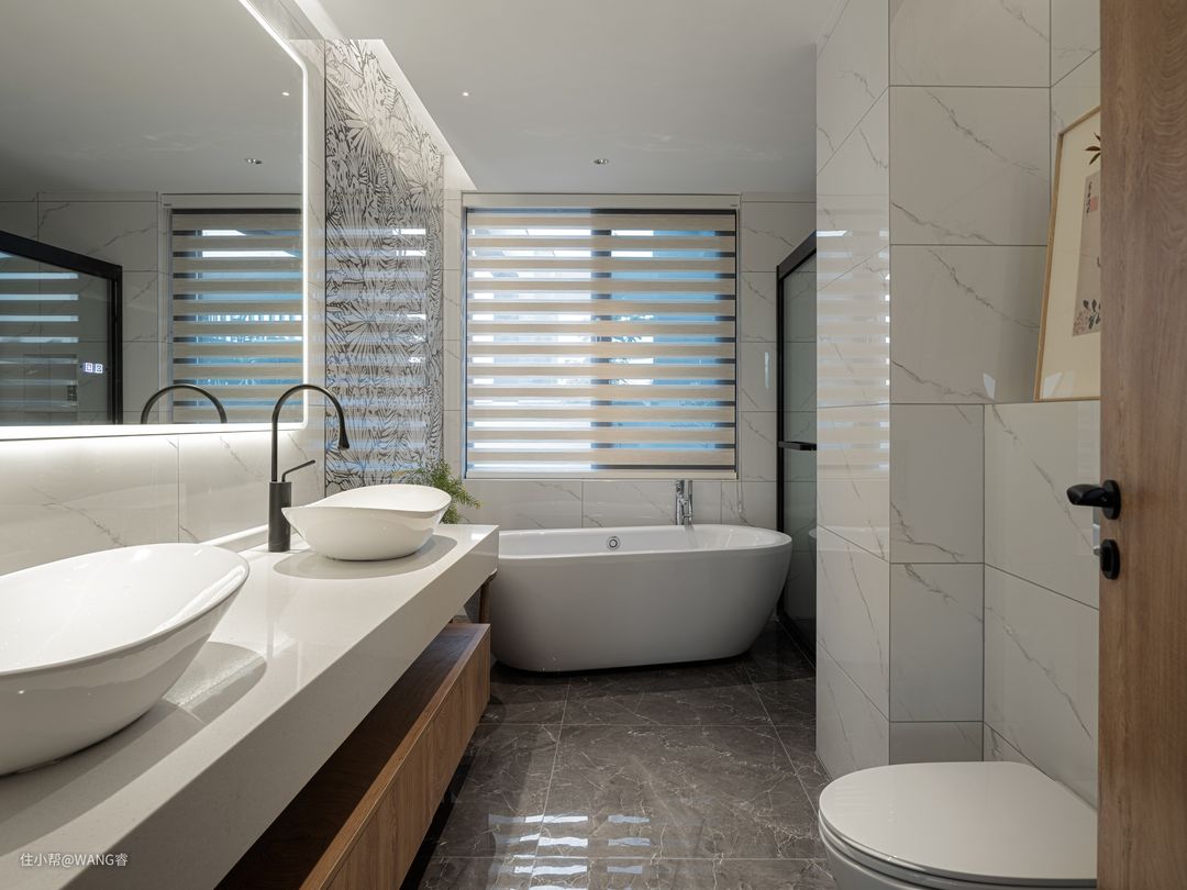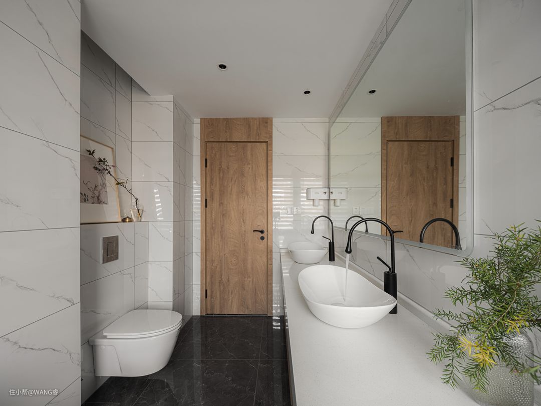 从浴缸看出去的视角,左边是悬挂马桶,利用现场结构预留了个小平台,方便平时置花或者香薰.