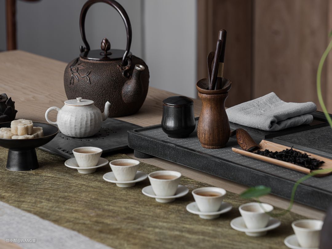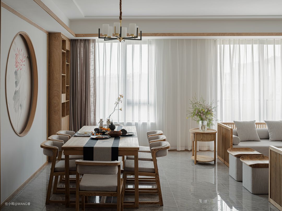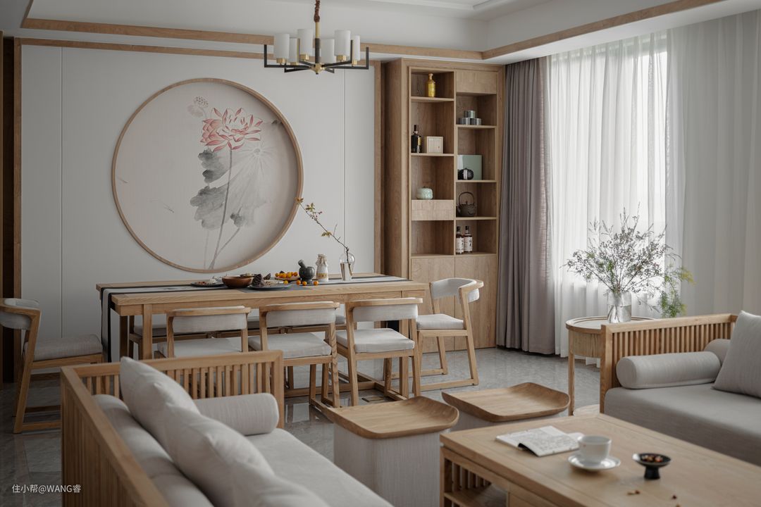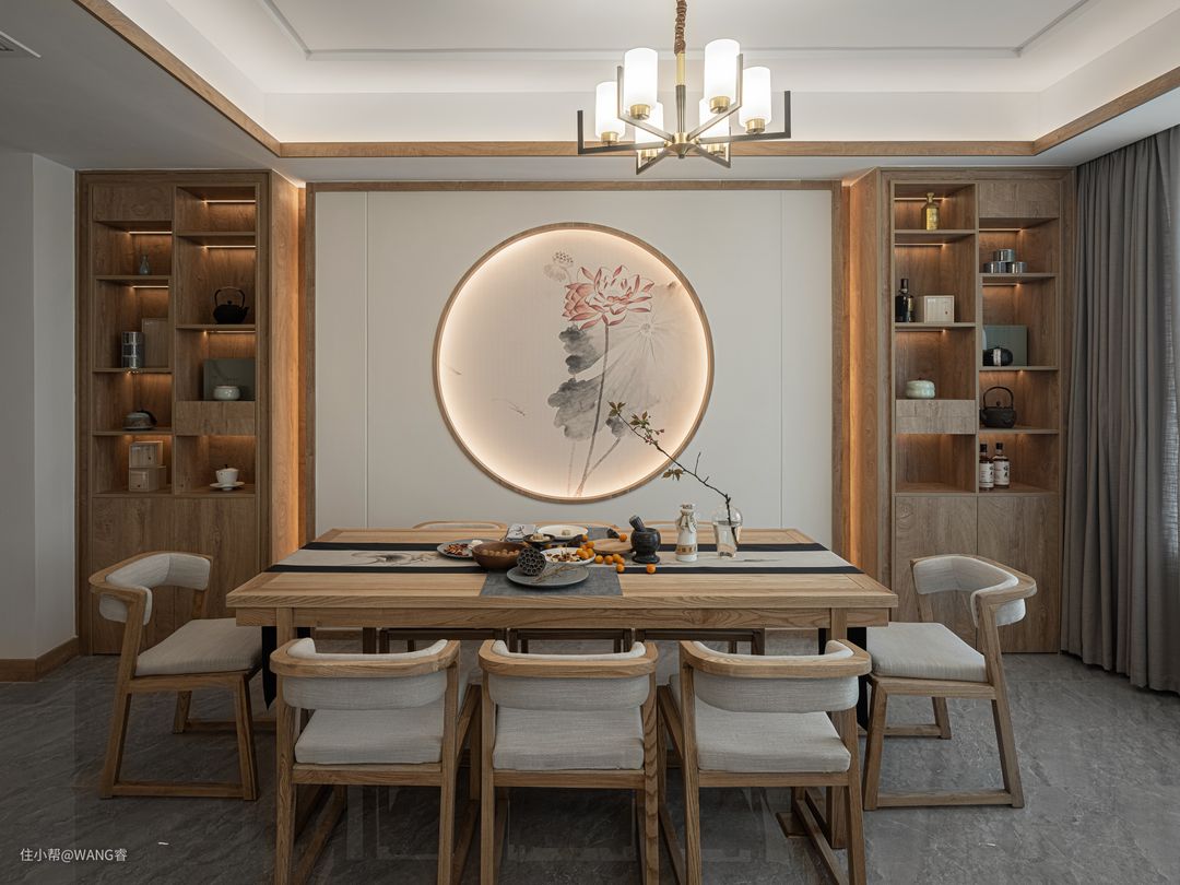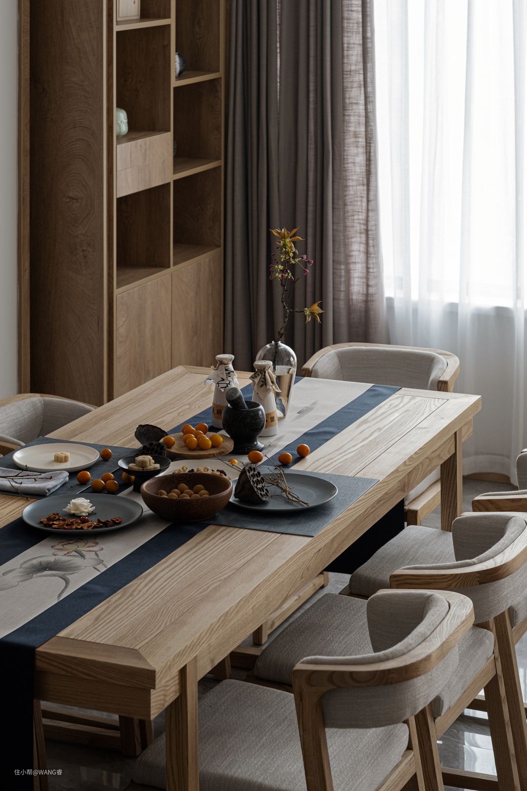 餐桌椅细节:原木与棉麻的搭配经久耐看.叠色桌旗上淡雅的荷花与餐厅造型墙面呼应,而随意的插花与餐食也让空间灵动,且充满生活气息.