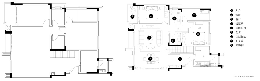 户型分析: 1-楼梯位置既定,可改动区间较小.主要让空间使用更舒适合理. 户型改造: 1-将生活区搭建,扩大生活阳台的使用面积. 2-将儿子房门洞移动,避出进生活阳台必须从卧室过,同时改变过道门洞过密的问题.