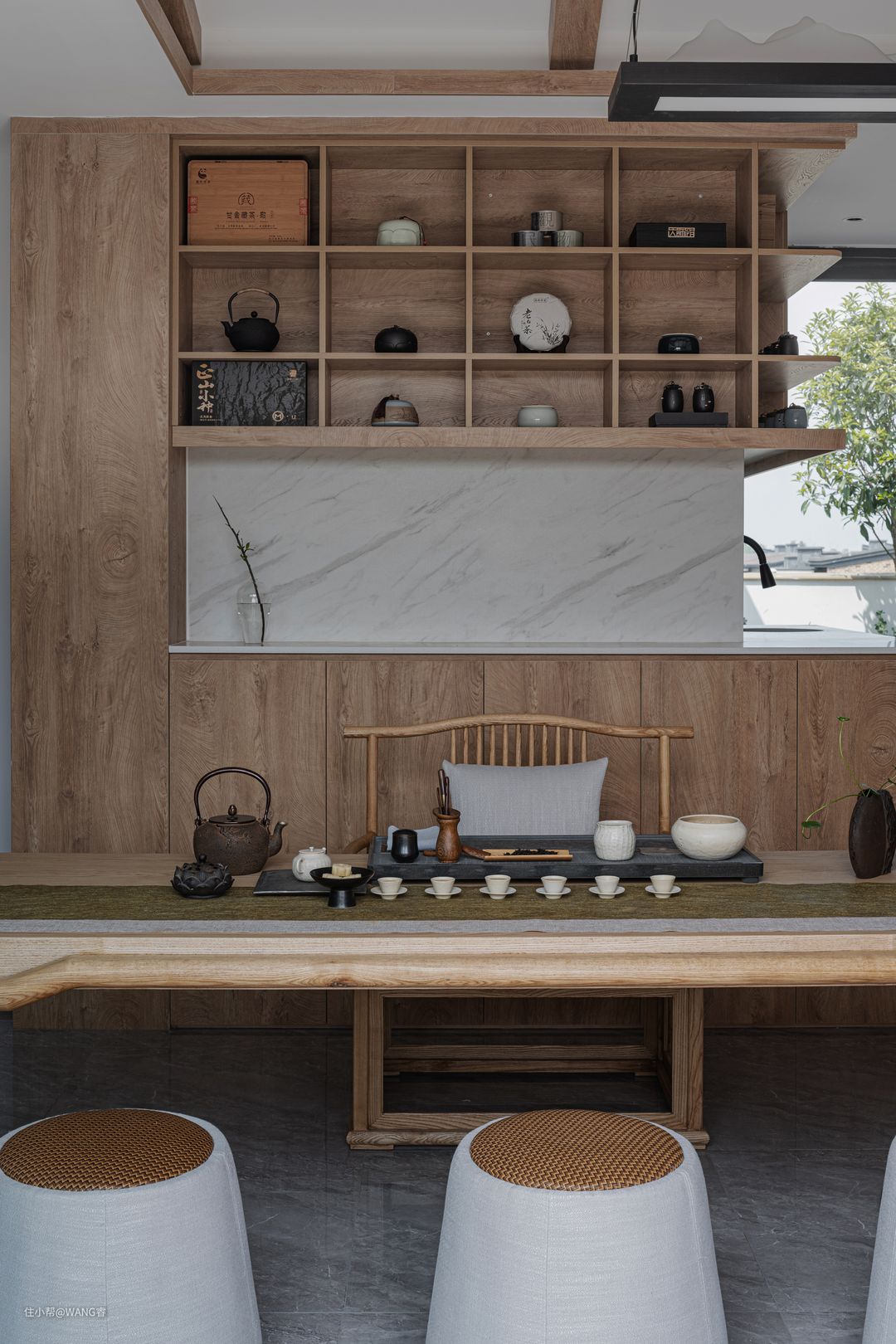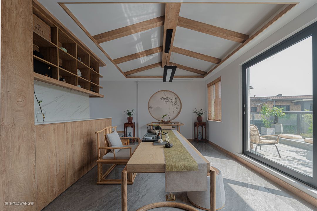 上楼即是开放的茶室区域,顶面做坡顶设计拉高层高,正对简单的竹子背景造型墙,与窗外植物进行虚实呼应.