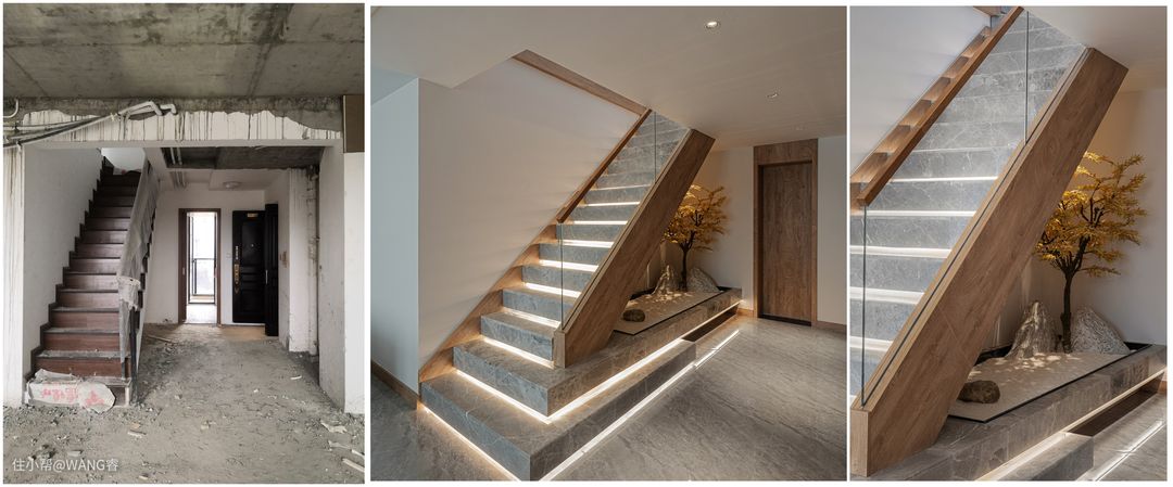 从餐厅看向楼梯位置 主要问题: 1-原有楼梯梯步过高,爬起来费力. 2-入户即是楼梯,美观问题需要考虑. 3-顶面层次太乱. 主要调整方向: 1-改善踏步高度.让楼梯走起来不累. 2-打造景观楼梯. 解决方案: 1-算好踏步,用木作基层一步步去调整到合理高度. 2-楼梯与造景结合处理,美化空间. 3-利用灯源和玻璃栏杆,让楼梯看起来更轻盈.使得空间更通透.