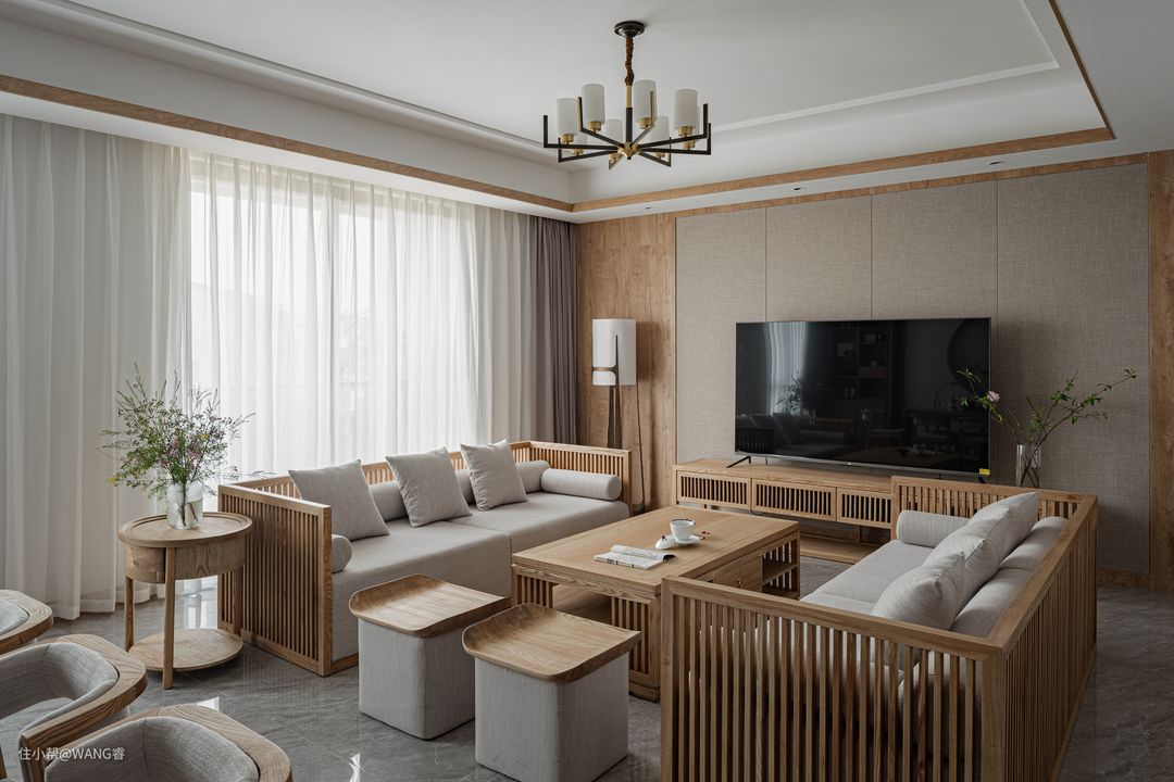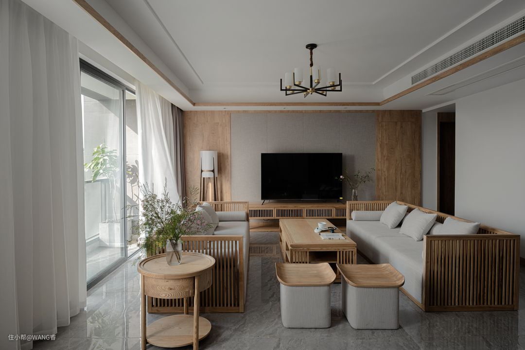 从餐厅看向客厅:与餐厅造型墙对应的即是电视墙,中间是定制素色硬包,右边是定制的隐形门,与左边护墙板造型呼应.整体空间色调依旧是原木色为主.