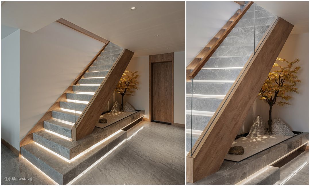 进门正对即是楼梯,设计上就考虑楼梯与景观邂逅的手法.配以柔和的灯光,打造氛围感. 右边的门内是厨房区域,因为是精装房,跟业主沟通后,只更换了门和地砖.其他未作改动.
