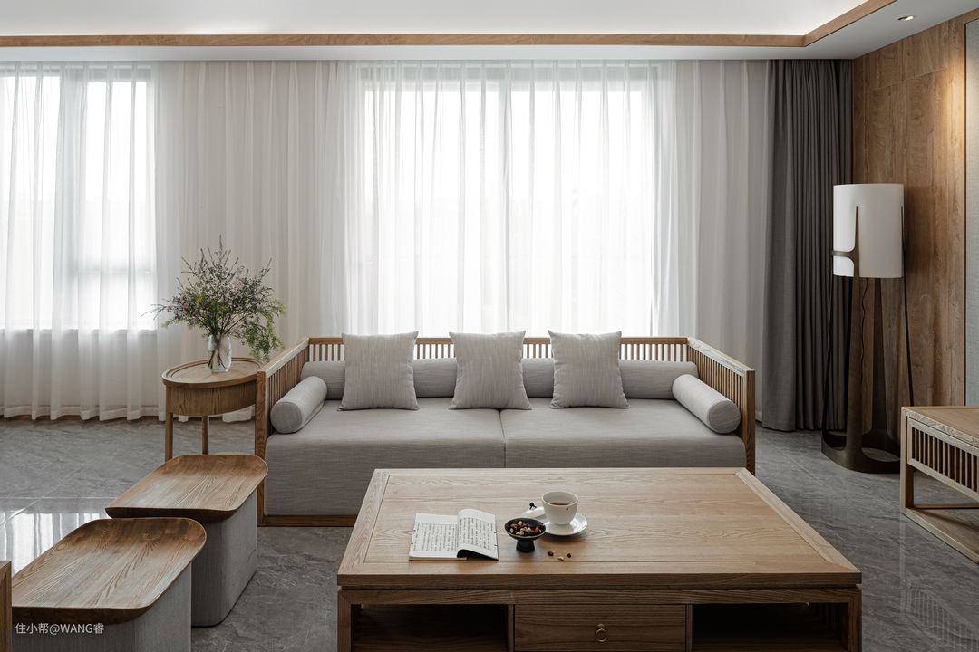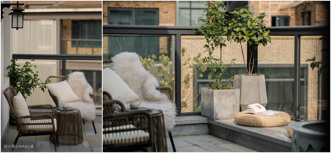 围合设计让空间可放置2个大沙发,满足3人同坐亦可休憩;由过道看向阳台,拉上白纱放上音乐,隔绝窗外的嘈杂,来一书一茶甚佳.