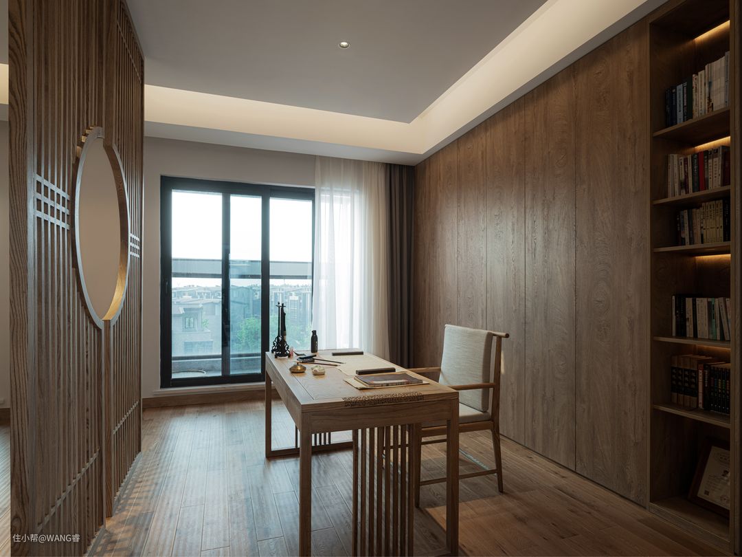 屏风后是开放式书房,睡前亦可引墨谱诗,书桌后是一组到顶多功能柜,保证收纳同时为空间增加细节.