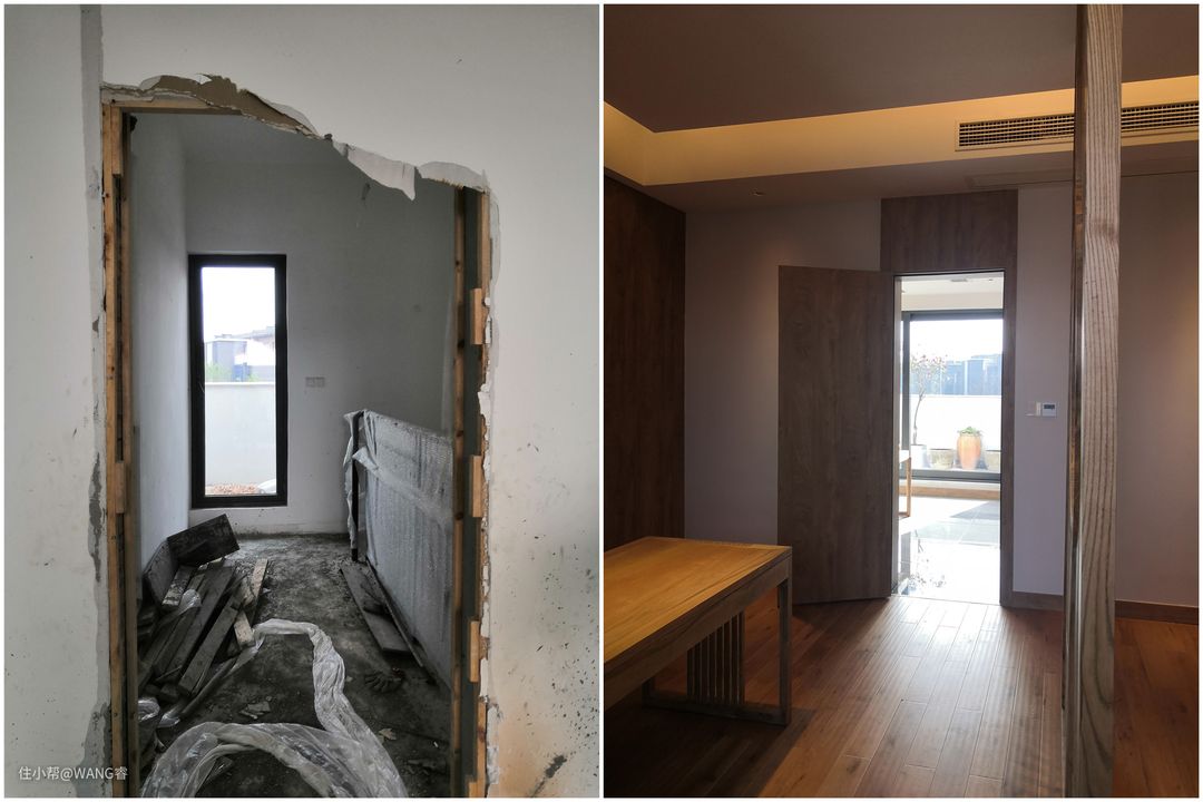 从卧室看向二楼转折厅位置 主要问题: 1-原有楼梯转折厅过小,只有楼梯上来后小门去阳台,光线不佳,位置也局促. 主要调整方向: 1-改善光线以及空间感. 2-让转折厅不止于过道功能. 解决方案: 1-拆除楼梯上来正对墙体,改善光线和空间感. 2-将阳台的门扩大,调整了光线同时更好的纳景入室内.