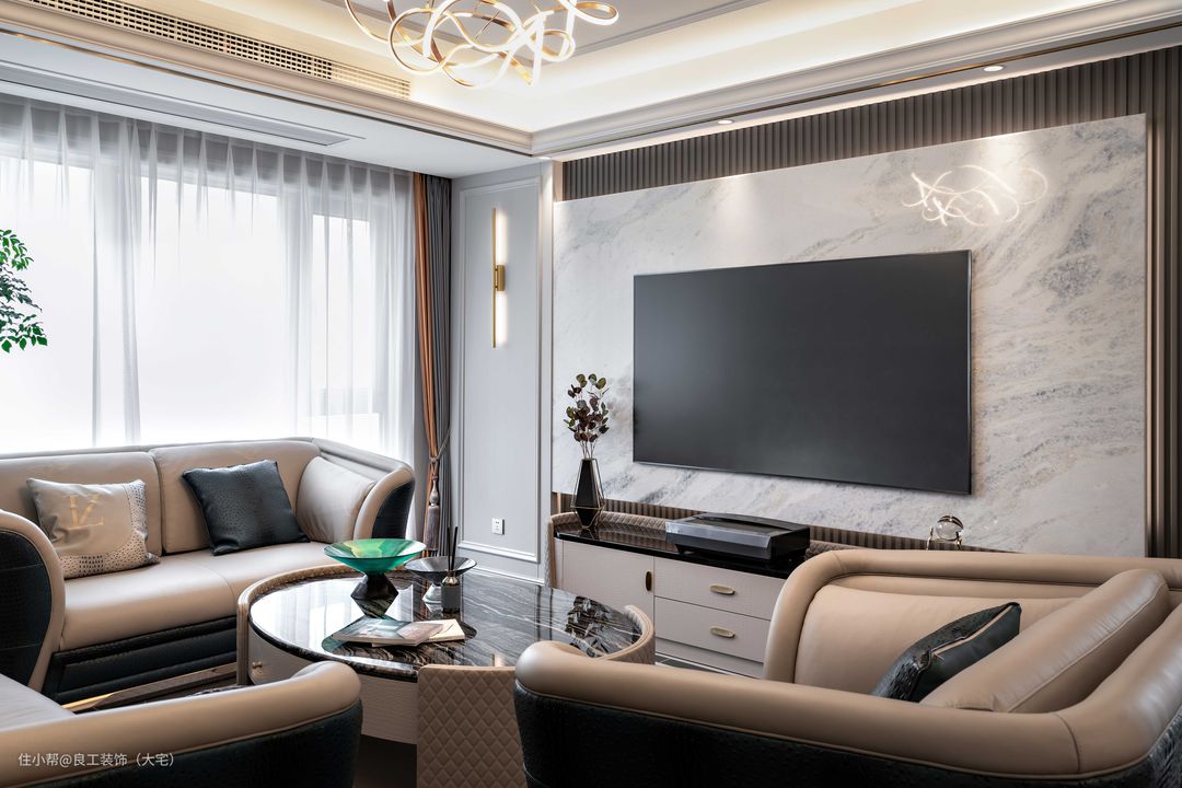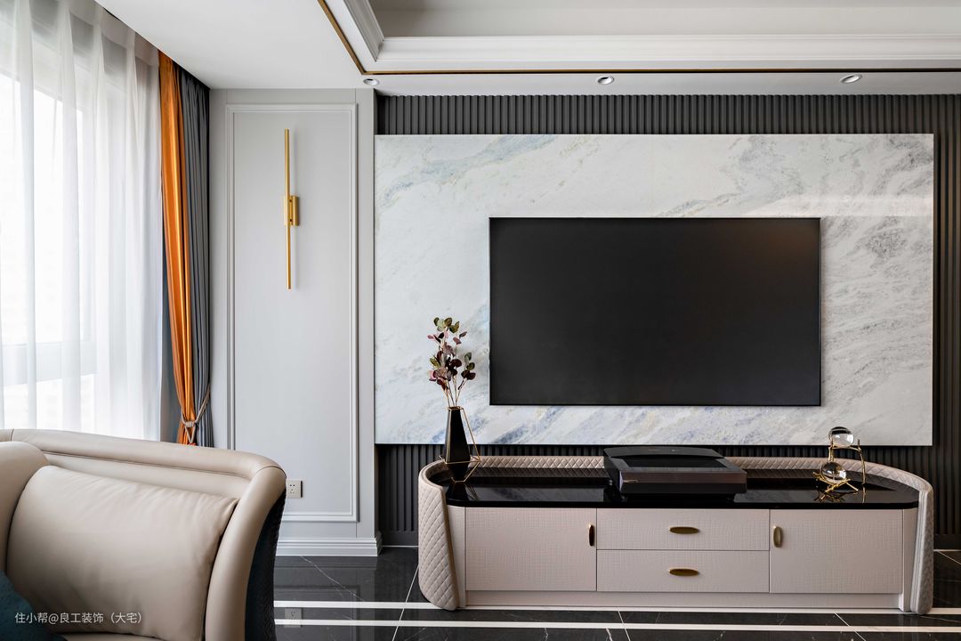 大理石与木饰面结合的电视背景墙大气不单调。金属线条的点缀丰富了空间层次,也提升了轻奢质感。