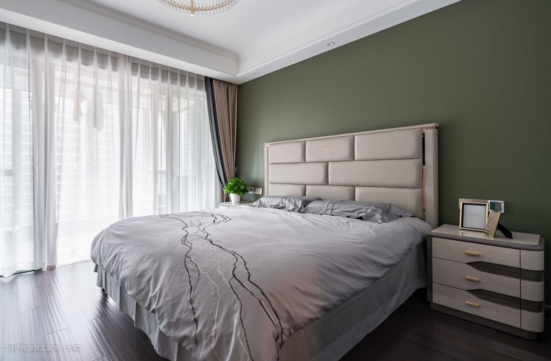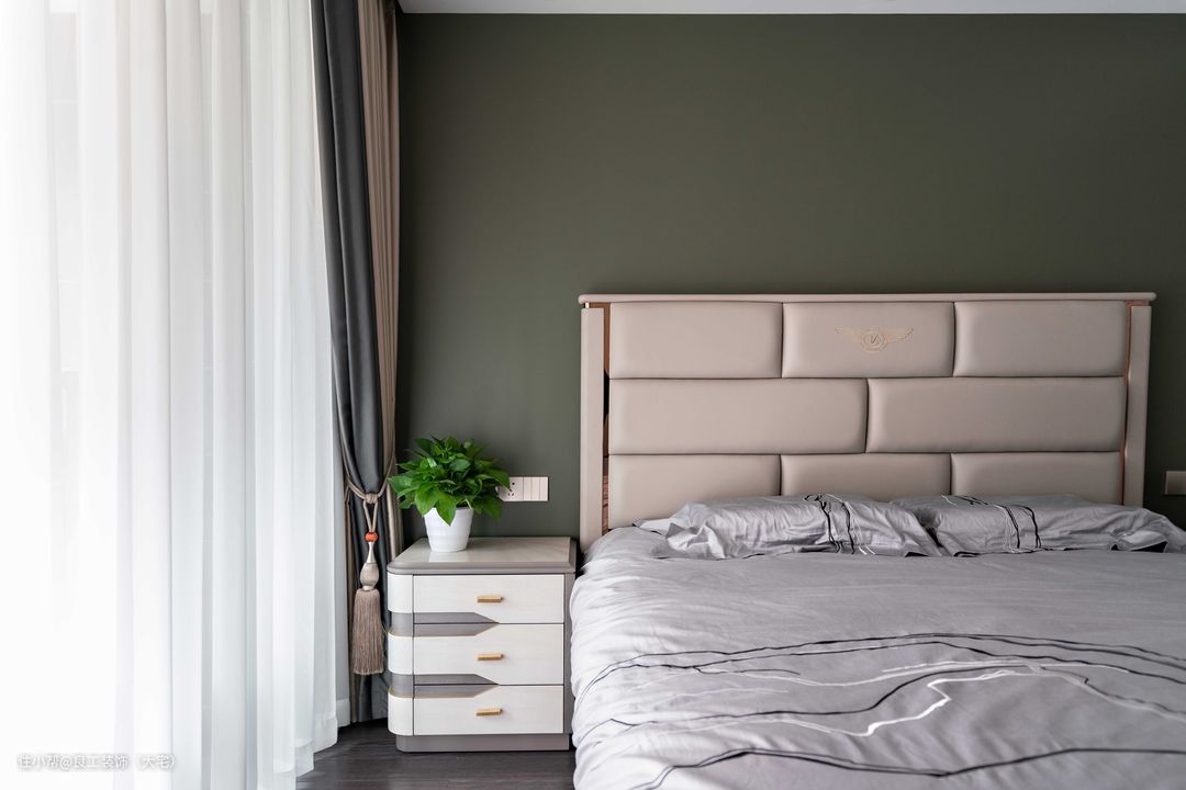 次卧采用了橄榄绿的墙面色调,安宁、静谧,轻易营造出舒适睡眠空间。少许的金属色点缀,烘托出精致氛围。
