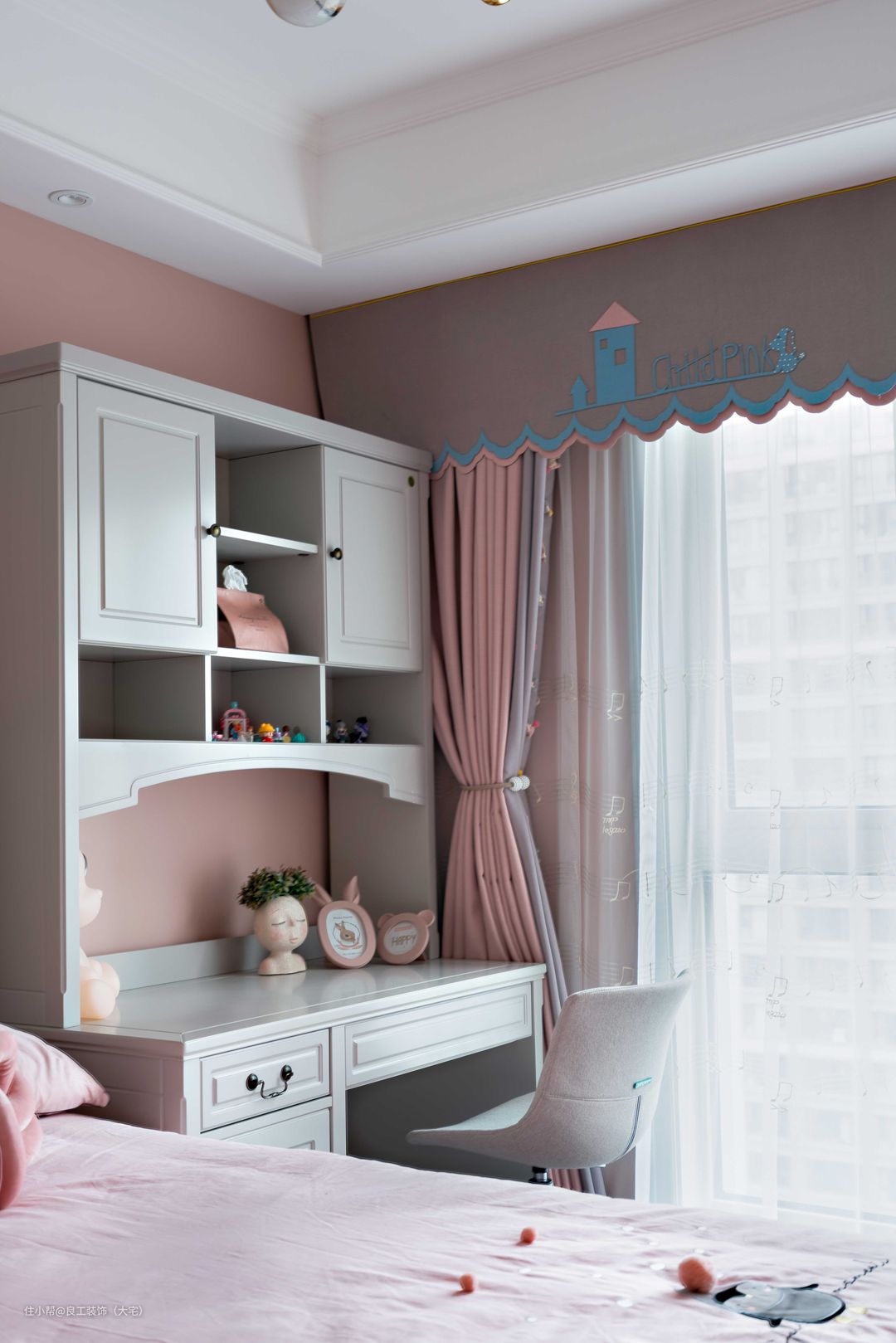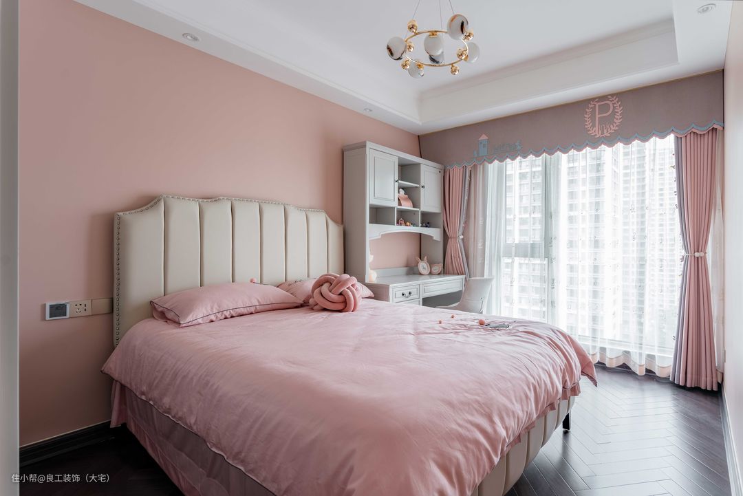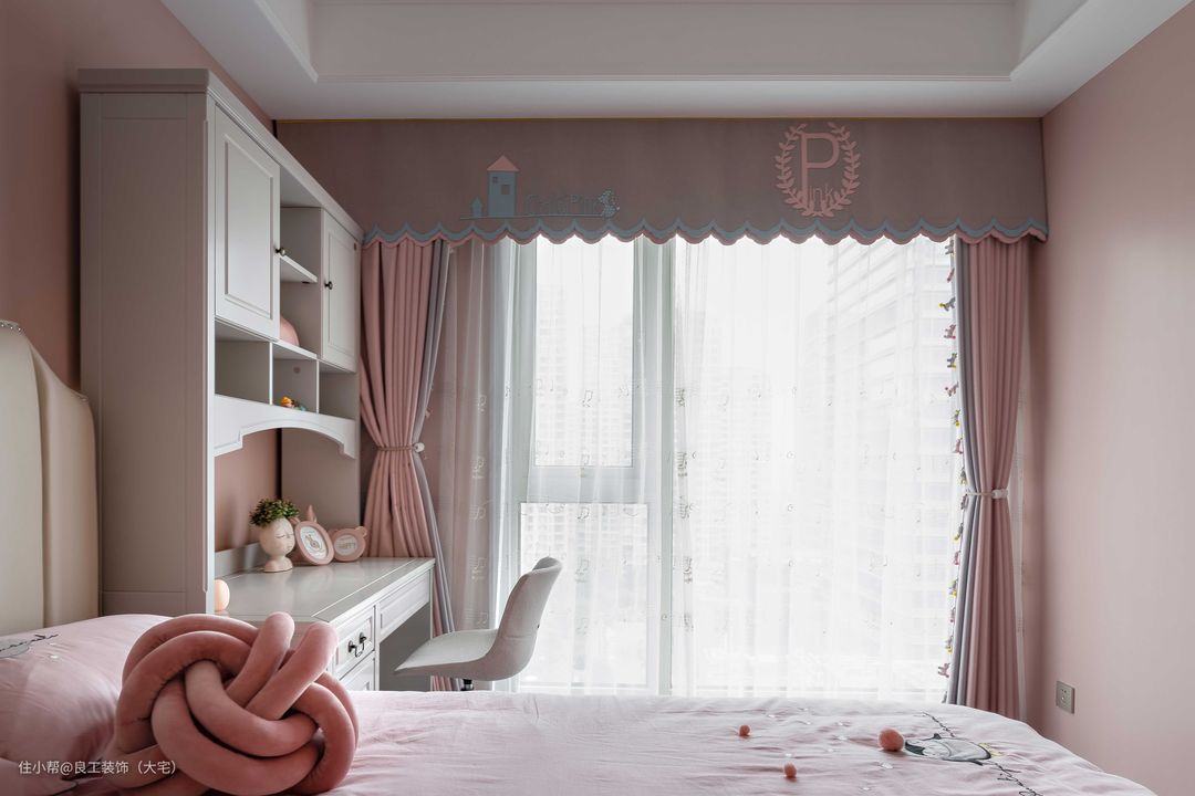 儿童房打造成了一个粉嫩的少女房,淡淡的粉色调墙面与布艺床品,每一个元素都潜藏了童真童趣。