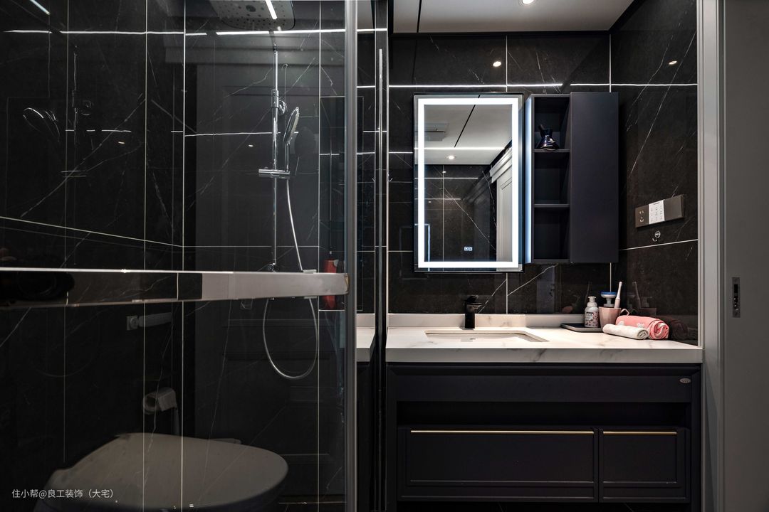 卫生间以经典星空黑为主调,大理石主材让空间更富有质感,简约于形,优雅于里。
